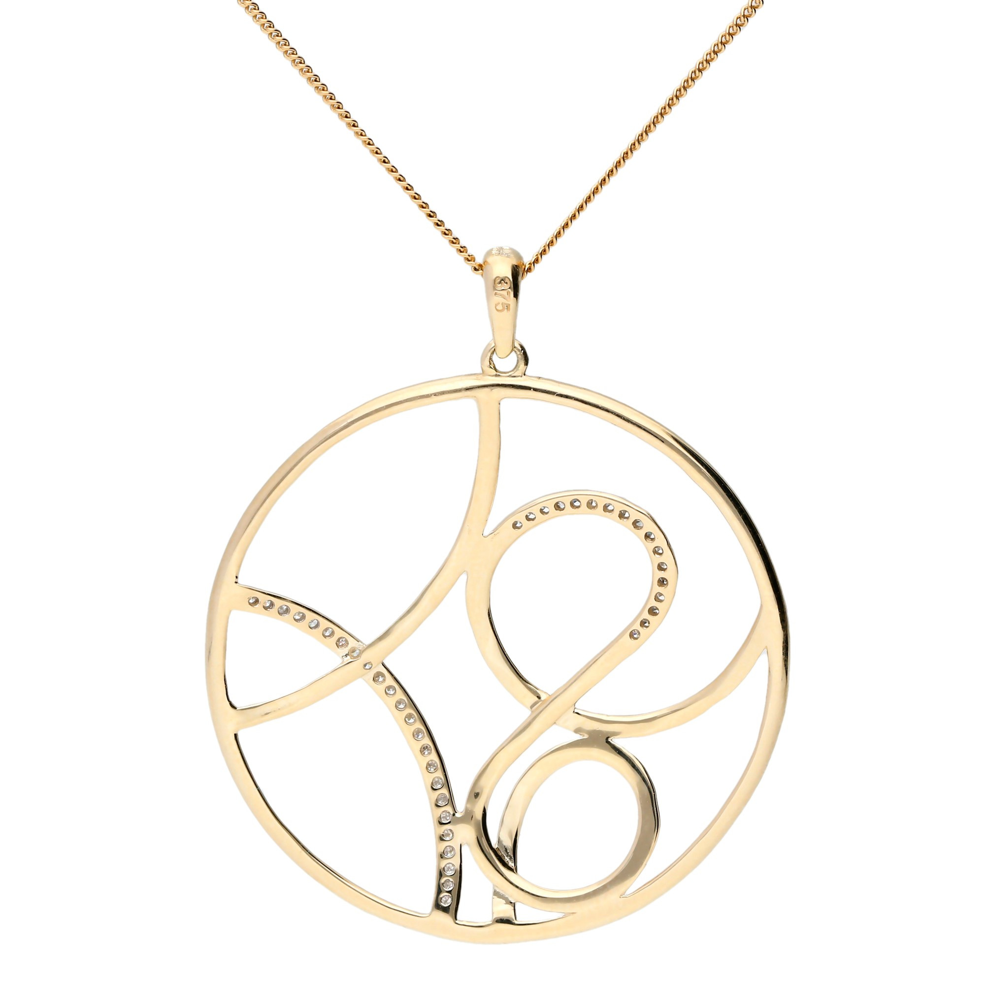 Introducing our striking 9ct yellow gold pendant, a modern masterpiece featuring an openwork circle adorned with whimsical squiggles of gold. This unique design is partially set with tiny accent diamonds that catch the light and sparkle with every movement. The playful arrangement of gold and diamonds offers a fresh take on classic elegance, making it a versatile piece for any jewellery lover. Suspended from a polished bail, this pendant is presented on a complementary chain, ready to elevate any outfit. Perfect for day-to-night wear, it adds a touch of glamour and sophistication to your ensemble, making it a fabulous gift or a must-have addition to your own collection.