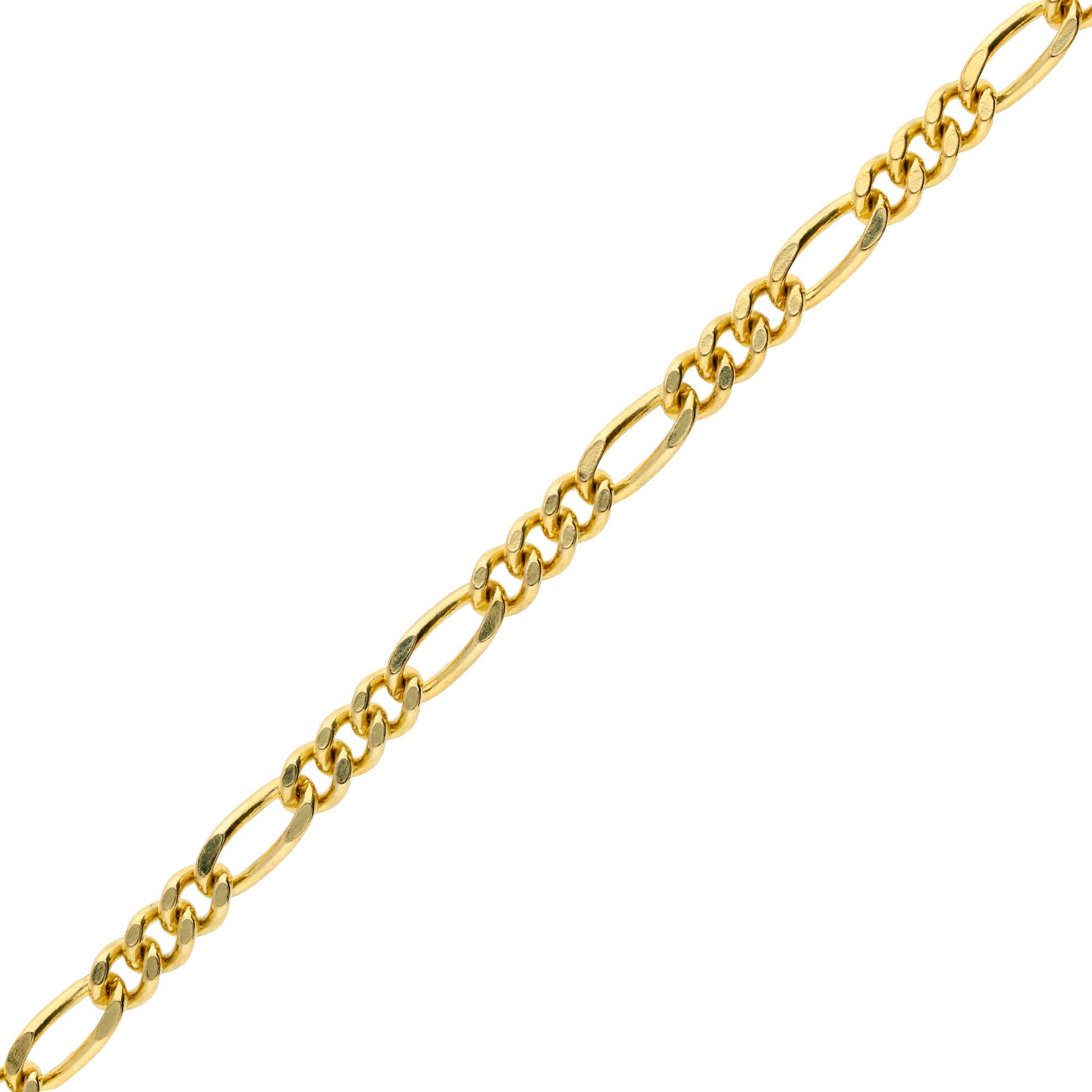 Elevate your style with this exquisite British-made 9ct Yellow Gold Figaro Chain Bracelet, a classic accessory that complements any wardrobe. This bracelet is expertly crafted in 9ct yellow gold and features the iconic Figaro pattern, a sequence of three short links followed by a longer one, creating a harmonious and eye-catching design. What sets this piece apart are the faceted edges of each link, meticulously cut to enhance the bracelet's sparkle and shine under any light. The robust clasp ensures it stays securely on your wrist, making it suitable for both daily wear and special occasions. This bracelet not only adds a touch of luxury to your outfit but also serves as a timeless piece in your jewellery collection.