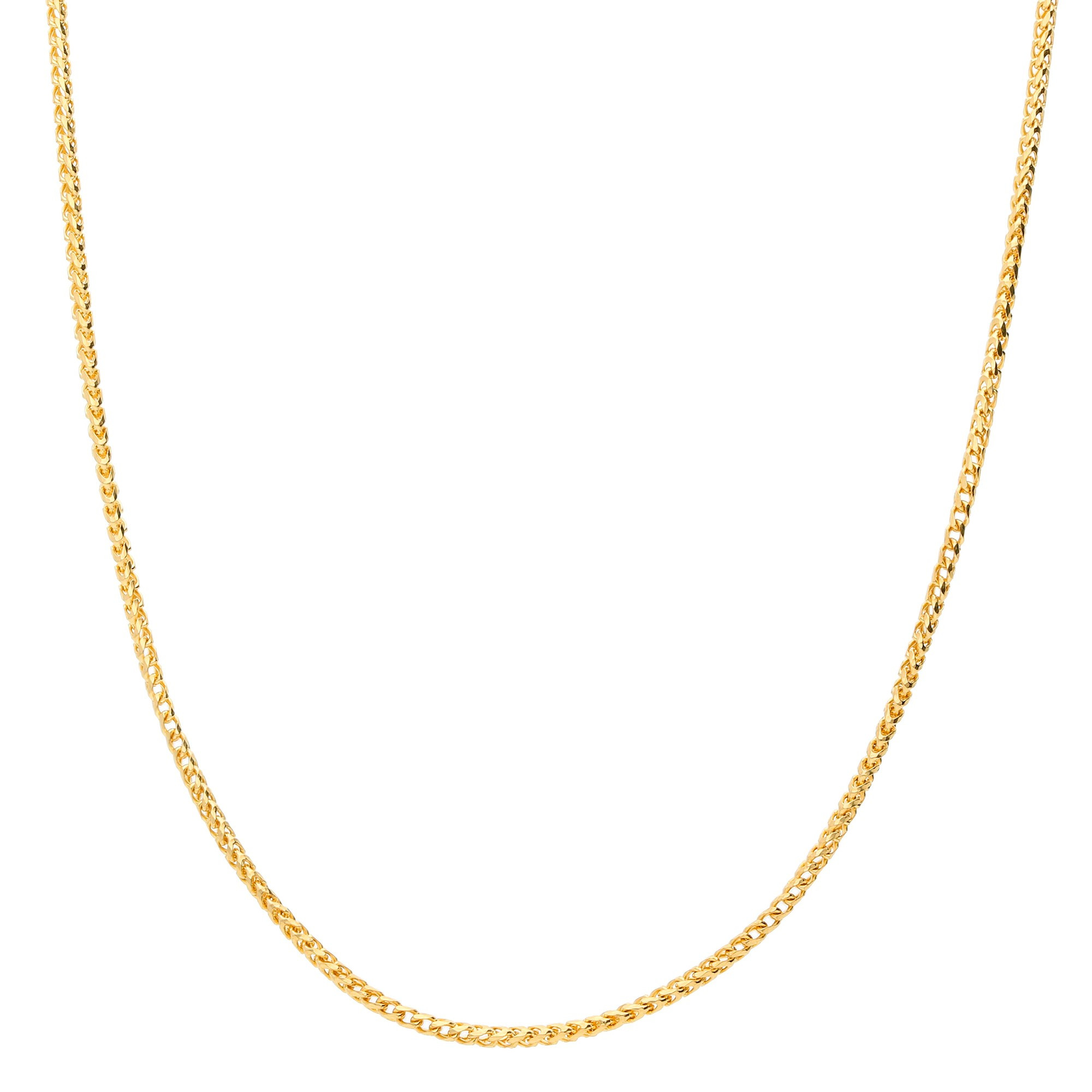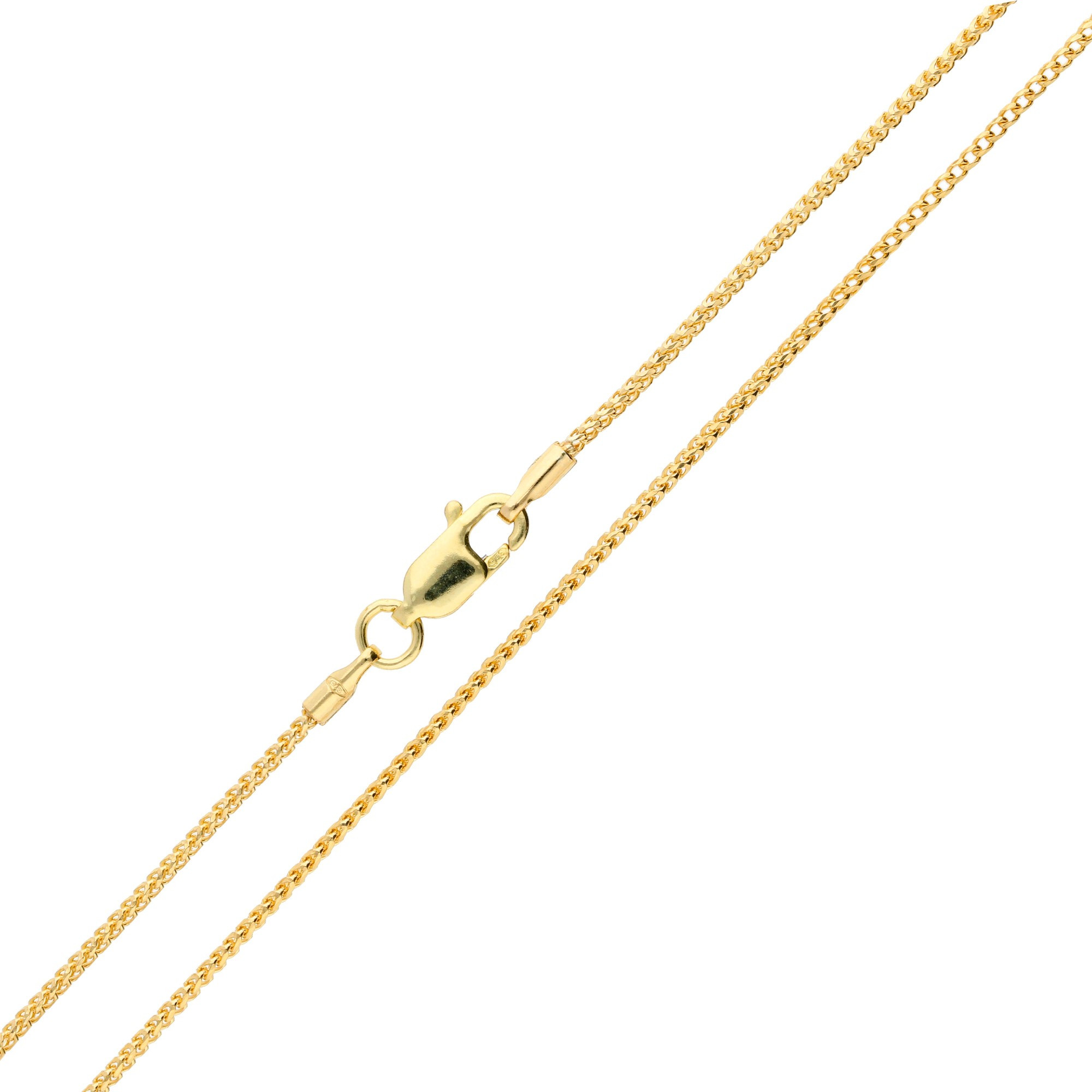 Discover the elegance of our 1.10mm Faceted 9ct Yellow Gold Franco Chain, a sleek and radiant accessory that enhances any pendant with its refined shine. This British made chain features a unique Franco design, similar in appearance to a snake chain, with each link meticulously faceted to catch the light and sparkle. Crafted from high quality 9ct yellow gold, it provides a luxurious yet durable option for everyday wear or special occasions. Its slender 1.10mm gauge makes it an ideal choice for those seeking a subtle yet striking addition to their jewellery collection. Whether worn alone or adorned with your favourite pendant, this chain is sure to add a touch of sophistication to your look.