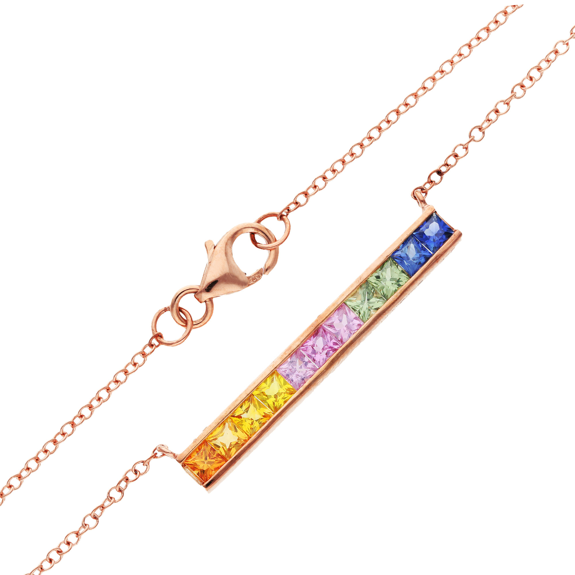 This stunning 9ct rose gold necklace features a sleek bar design, channel set with square cut sapphires in a spectrum of vibrant colours, totalling 1.25ct. The rainbow effect created by the varying hues of the sapphires adds a unique and eye-catching touch to this elegant piece. The warm tones of the rose gold beautifully complement the rich colours of the sapphires, making this necklace a standout accessory. Complete with an integral rose gold chain, this necklace sits gracefully on the neckline, perfect for both everyday wear and special occasions. A stylish and contemporary addition to any jewellery collection, this rainbow sapphire necklace is ideal for those who appreciate vibrant, colourful jewellery.