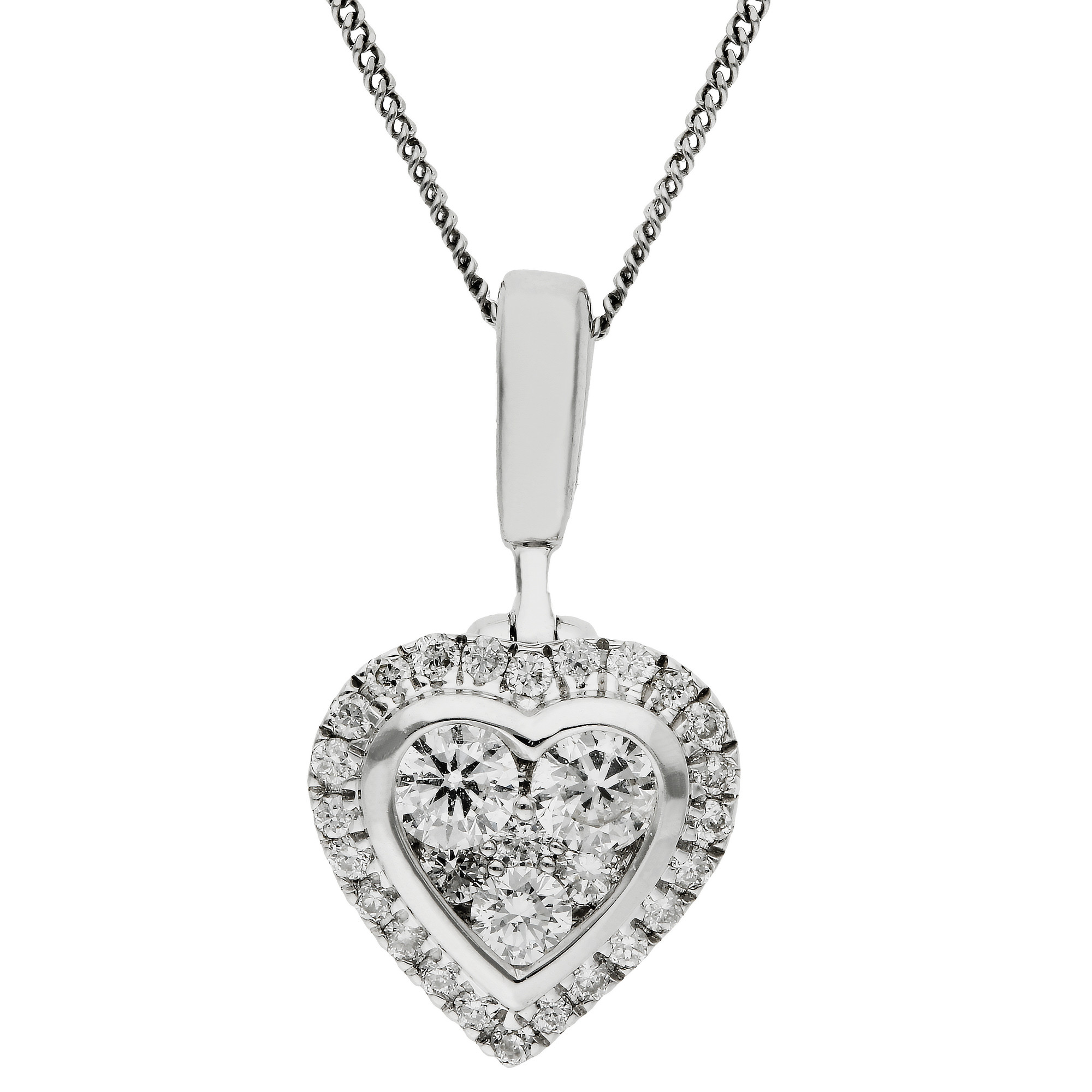 Introducing our exquisite 9ct White Gold 0.25ct Diamond Heart Pendant, a symbol of love crafted with precision and elegance. This captivating pendant features a heart shaped cluster of diamonds in various sizes at its core, beautifully framed by a white gold heart outline and an additional halo of sparkling diamonds. Each diamond is meticulously set to create a dazzling display of brilliance and depth. The pendant is suspended from a polished bail and comes complete with a sleek white gold chain, making it ready to wear or gift immediately. Ideal for anniversaries, special occasions, or as a heartfelt gift, this diamond heart pendant is a timeless piece that adds a touch of romance and luxury to any jewellery collection.