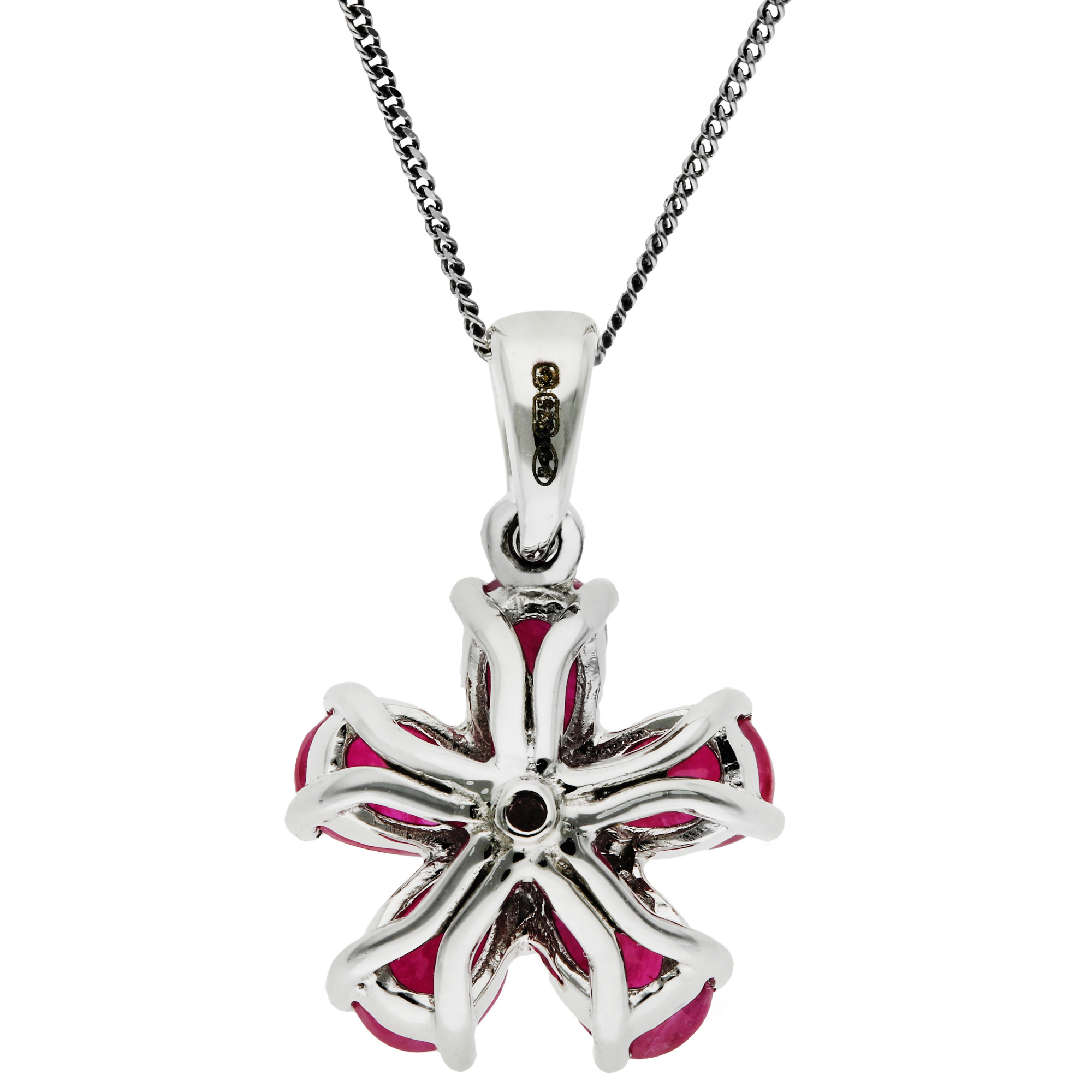 Discover a touch of timeless elegance with our 9ct White Gold Diamond & Ruby Pendant, a piece that combines rich colour with refined sparkle. This exquisite pendant features five teardrop shaped rubies, their deep crimson tones gathered gracefully around a central round diamond that shimmers from within a secure bezel setting. Suspended from a polished white gold bail and complete with a chain in the length of your choice, this pendant is designed to sit beautifully at the neckline, adding sophistication to any look. Whether worn as a statement piece or layered for a more contemporary style, this ruby and diamond pendant captures the essence of elegance and classic charm. Ideal as a gift or a treasured addition to your own jewellery collection, it embodies luxury with a touch of romance.