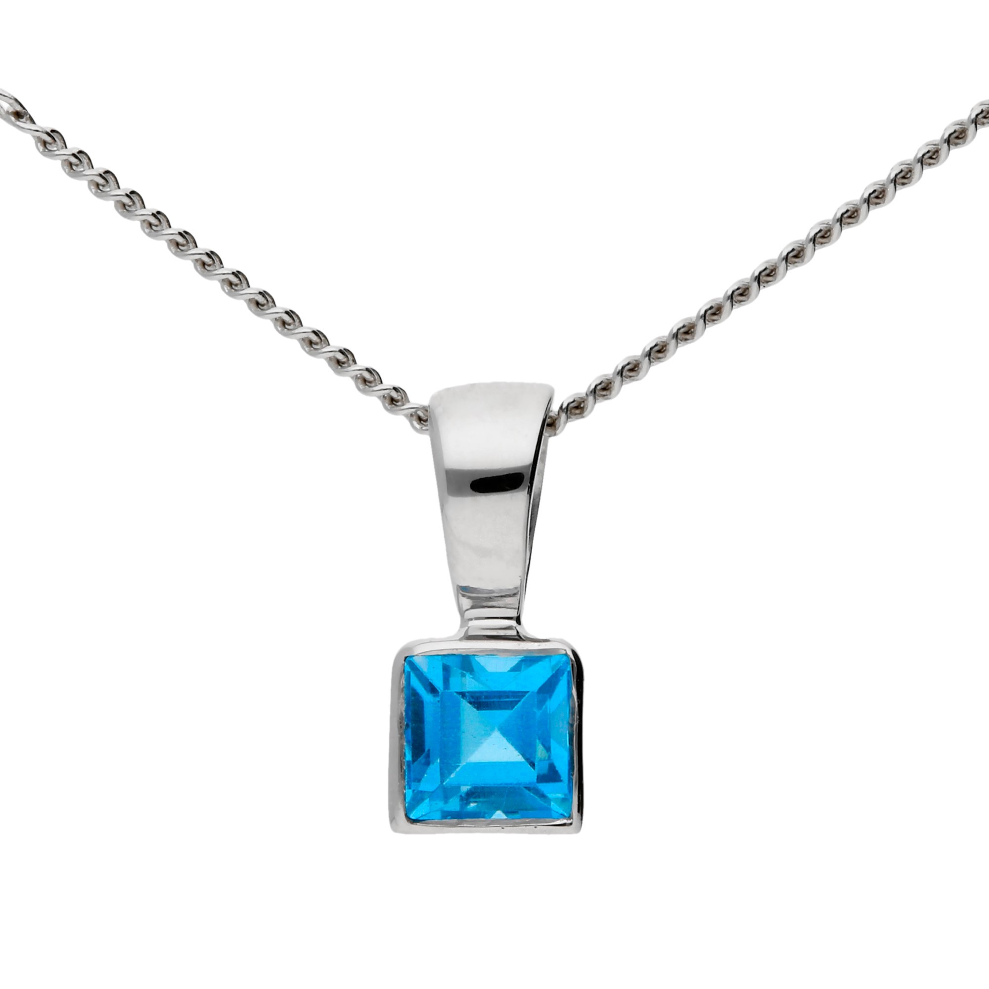Add a touch of sophistication to your jewellery collection with this elegant 9ct white gold blue topaz pendant. Featuring a dazzling 0.10ct square cut blue topaz, this pendant showcases the gemstone’s vibrant hue and brilliant sparkle. The topaz is beautifully bezel set in polished white gold, creating a sleek and modern design.