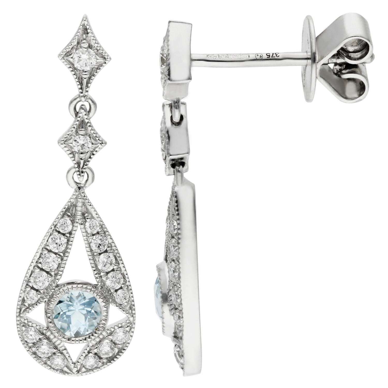 Indulge in elegance with our 9ct White Gold Diamond and 0.30ct Aquamarine Drop Earrings. These ornate earrings feature a central round cut aquamarine, surrounded by sparkling diamonds in a tear drop shape with intricate beaded edging. The earrings are crafted in three parts, including a two part diamond surmount and a tear drop at the bottom, creating a stunning cascade effect. Designed for women who appreciate fine jewellery, these drop earrings add a touch of sophistication to any outfit. Perfect for special occasions or everyday luxury, these earrings offer timeless beauty and charm. Enhance your jewellery collection with these exquisite 9ct white gold diamond and aquamarine drop earrings.