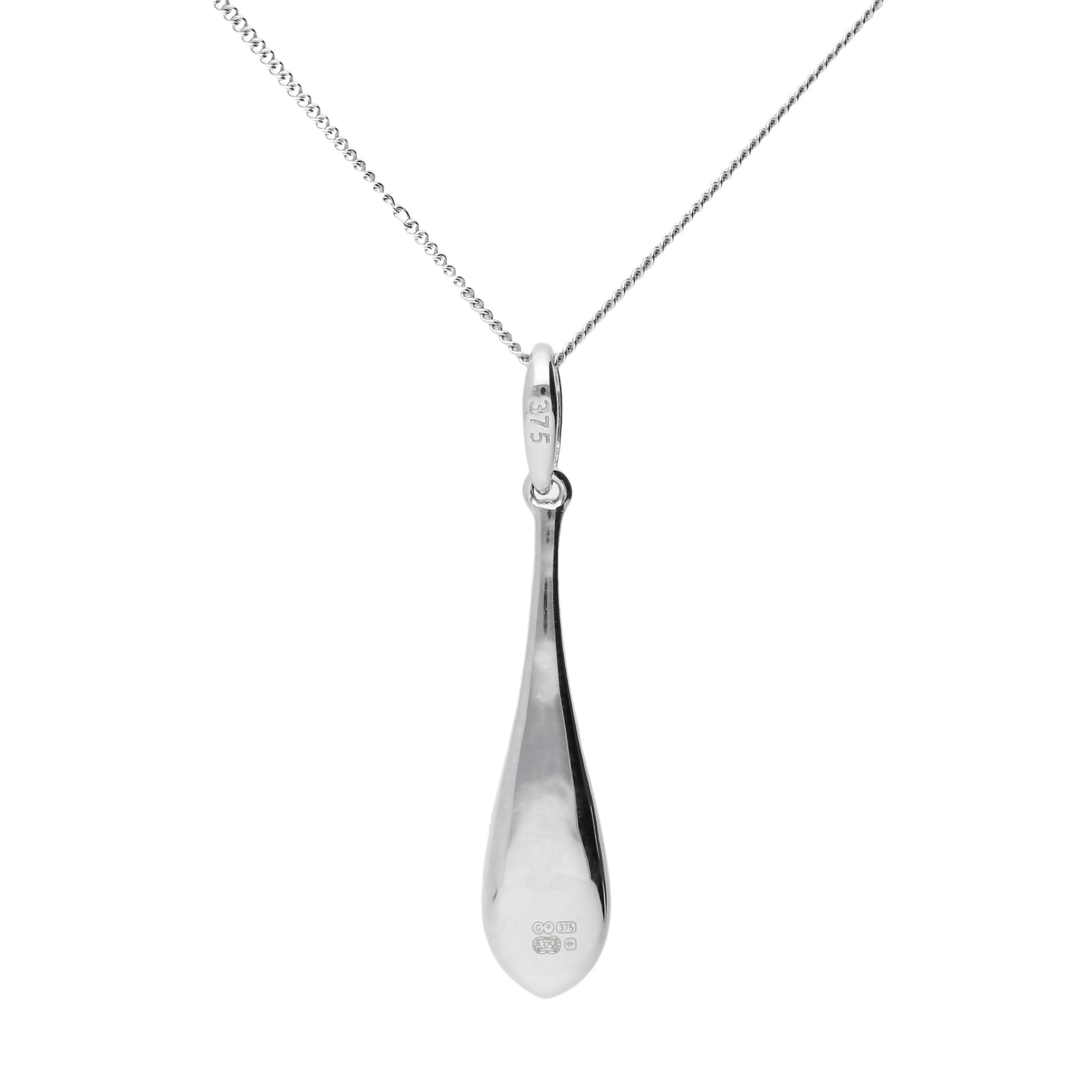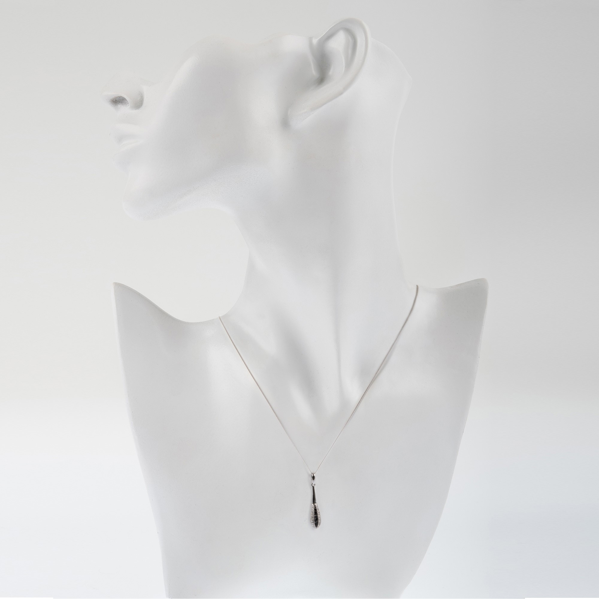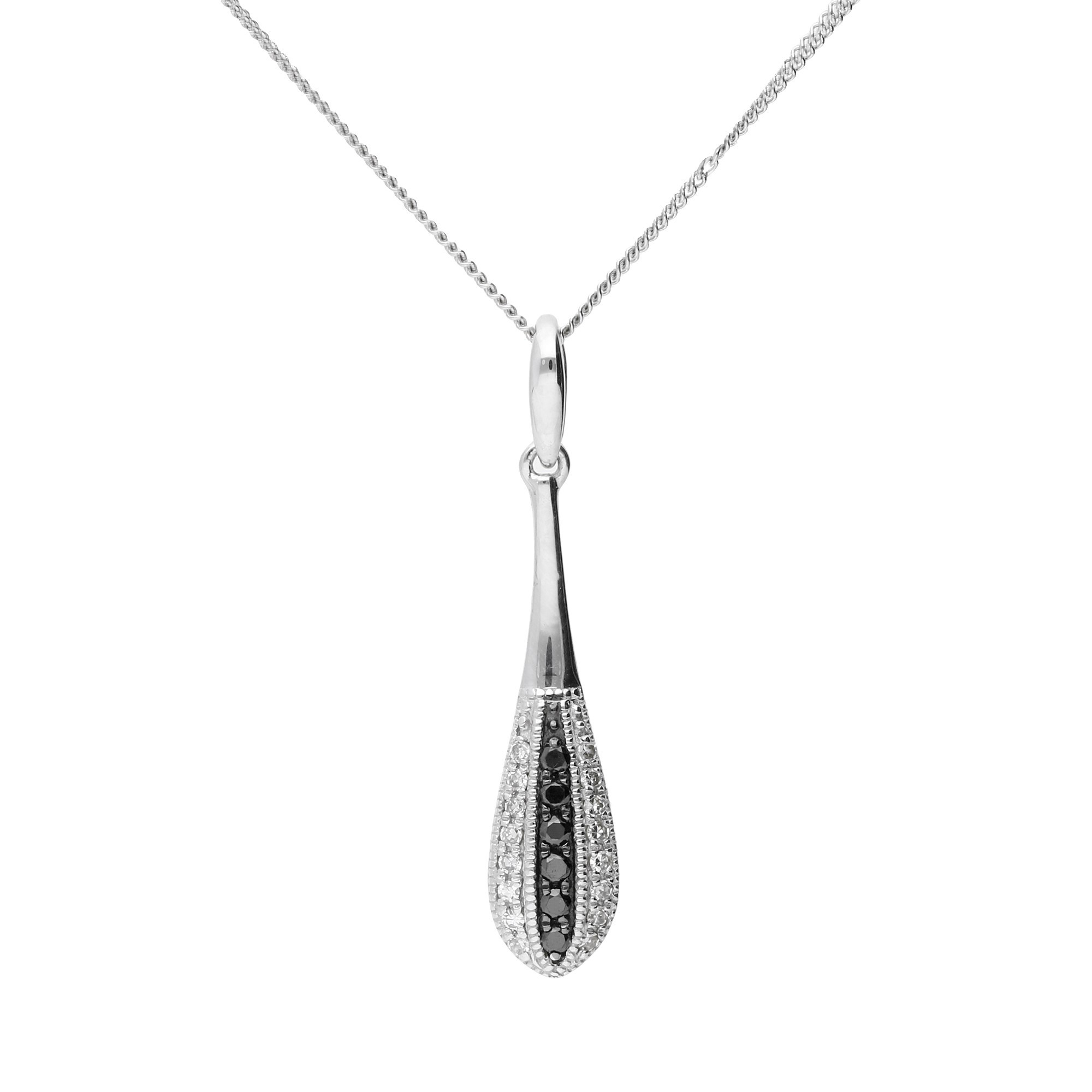 This elegant 9ct white gold tear shaped pendant offers a striking blend of classic beauty and modern appeal. The smooth white gold setting curves gracefully to form a gentle teardrop, creating the perfect backdrop for the contrasting sparkle within. A refined row of black diamond sits to one side, adding depth and drama, while a matching row of white diamond on the opposite side brings bright brilliance and a timeless sense of purity. Together they create a beautiful balance of light and shadow, making this pendant a captivating choice for both everyday style and special occasions.