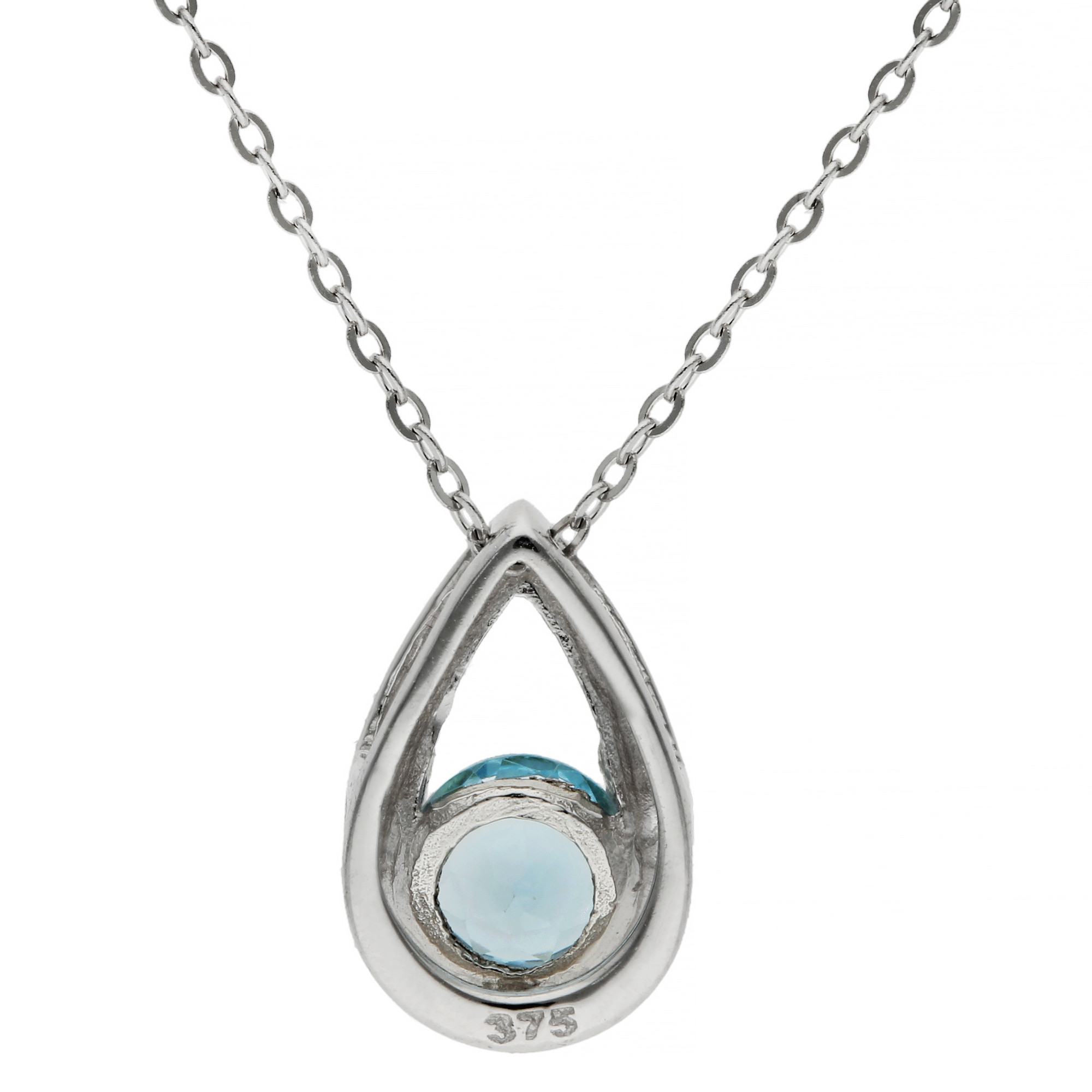 Introducing our stunning 9ct White Gold Sky Blue Topaz Pendant, a masterpiece of exquisite design and sparkling beauty. This pendant features a captivating round-cut sky blue topaz, brilliantly set at the base of an elegantly crafted pear shaped open work mount. The vibrant blue topaz radiates from within the lustrous 9ct white gold setting, creating a mesmerizing effect that catches the eye.