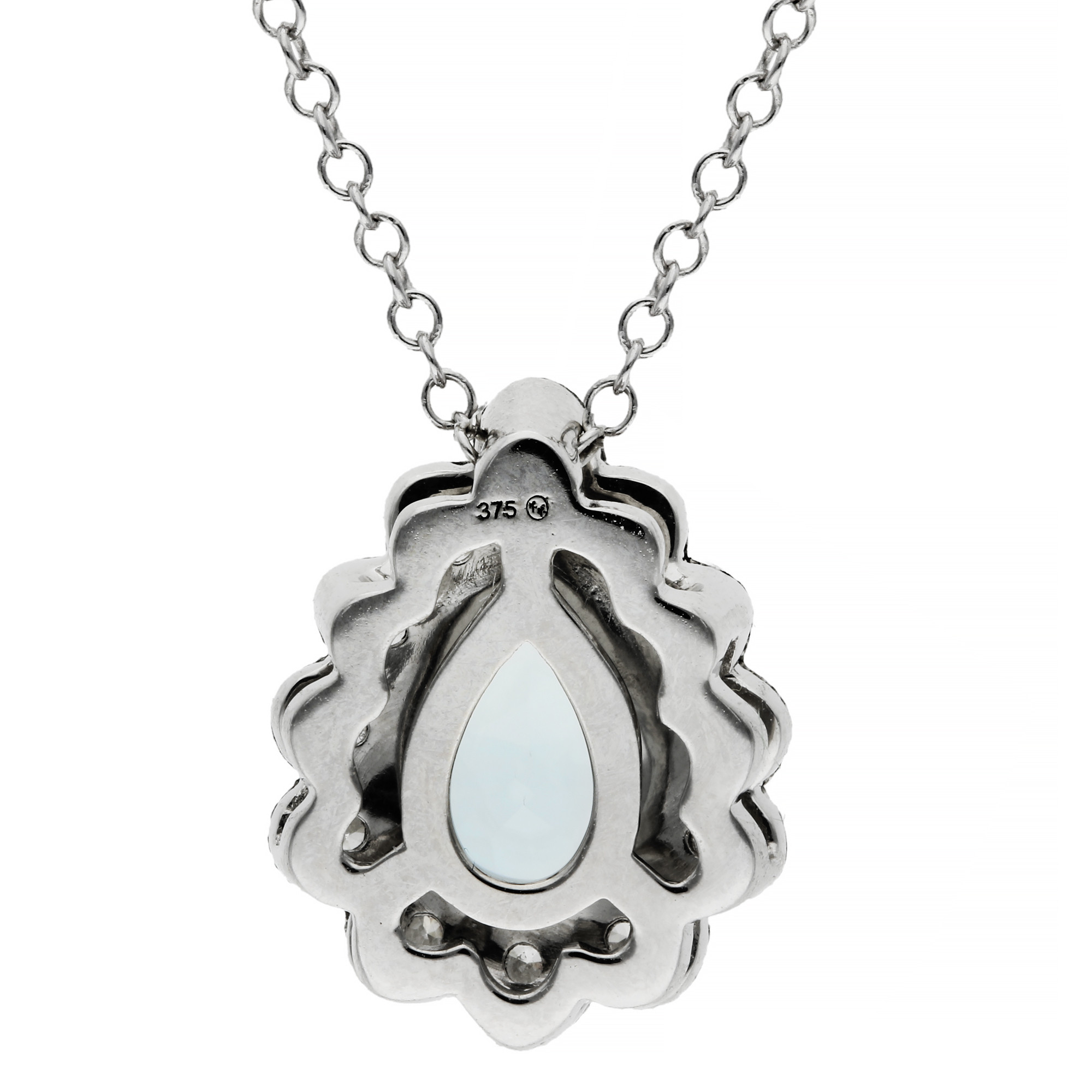 Introducing our exquisite 9ct White Gold Diamond & Aquamarine Necklace, a piece that combines timeless elegance with the serene beauty of the ocean. At its heart lies a pear cut aquamarine, its soft blue hue reminiscent of tranquil waters, framed beautifully within a halo of sparkling diamonds. Each diamond is meticulously set in a milgrain setting, adding a vintage touch and extra brilliance to this stunning piece. The pendant dangles gracefully from a delicate white gold chain, making it a perfect choice for both everyday wear and special occasions. This necklace not only captures the essence of elegance but also embodies the calming and soothing qualities of the aquamarine stone. Whether as a gift for a loved one or a treat for yourself, this Diamond & Aquamarine Necklace is sure to enchant and be cherished for years to come.