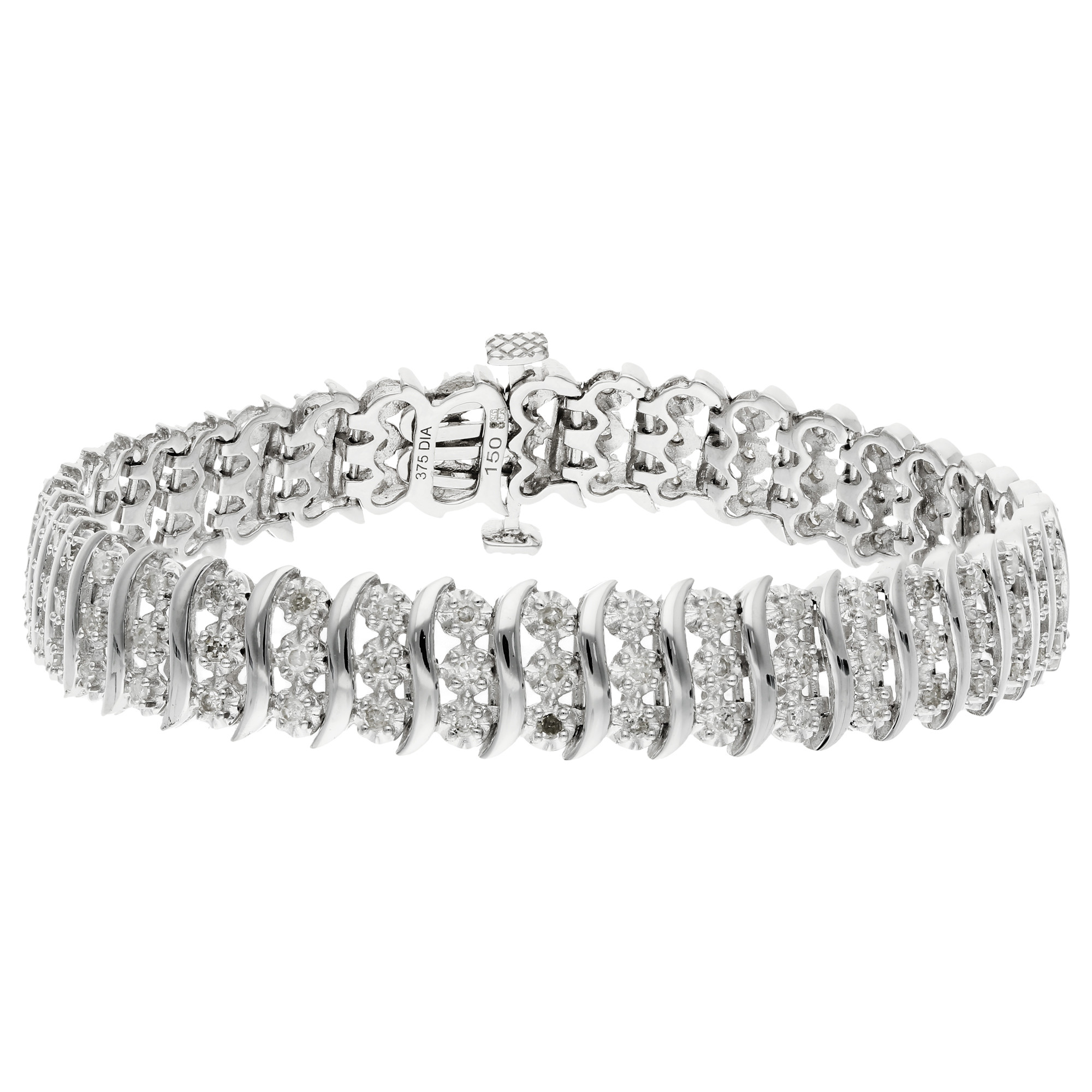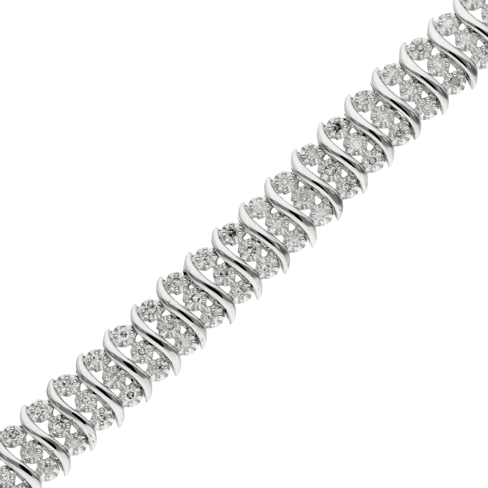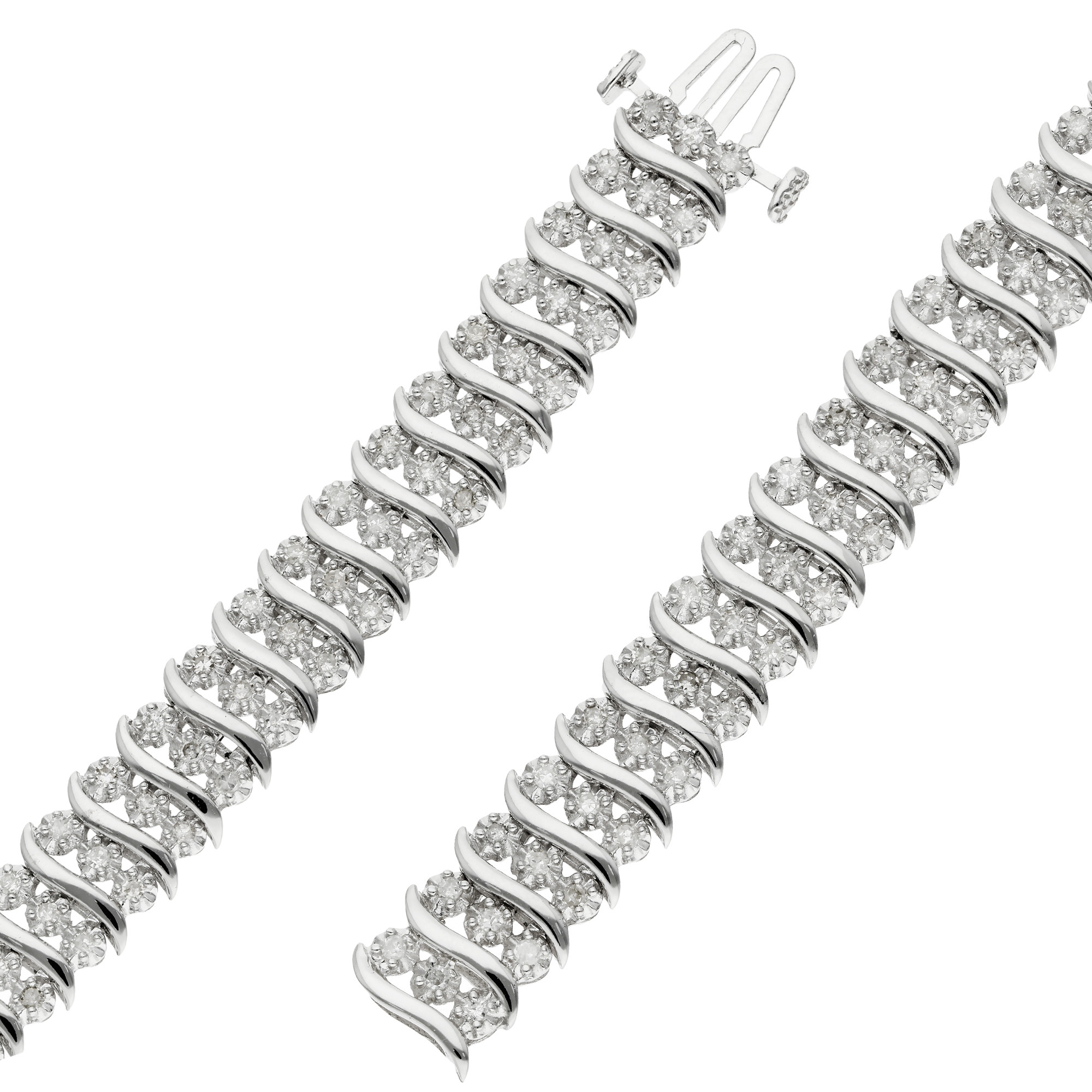 Introducing our exquisite 9ct White Gold Diamond Bracelet, a masterpiece of craftsmanship and elegance. This bracelet features a captivating design of shiny white gold waves, beautifully interspersed with trios of illusion set diamonds that sparkle with every movement. The fluidity of the waves and the brilliance of the diamonds create a harmonious blend of luxury and sophistication, making this bracelet a perfect gift for an April birthday or to celebrate a Diamond Anniversary. Its timeless elegance and refined style make it a cherished addition to any jewellery collection, sure to dazzle and impress on any occasion.