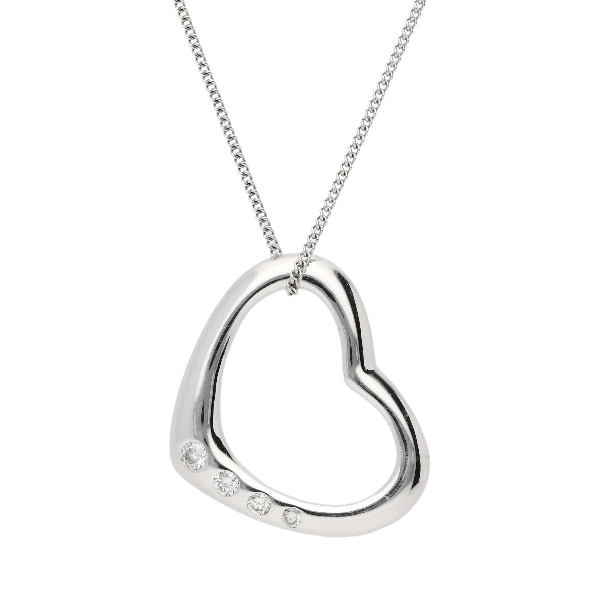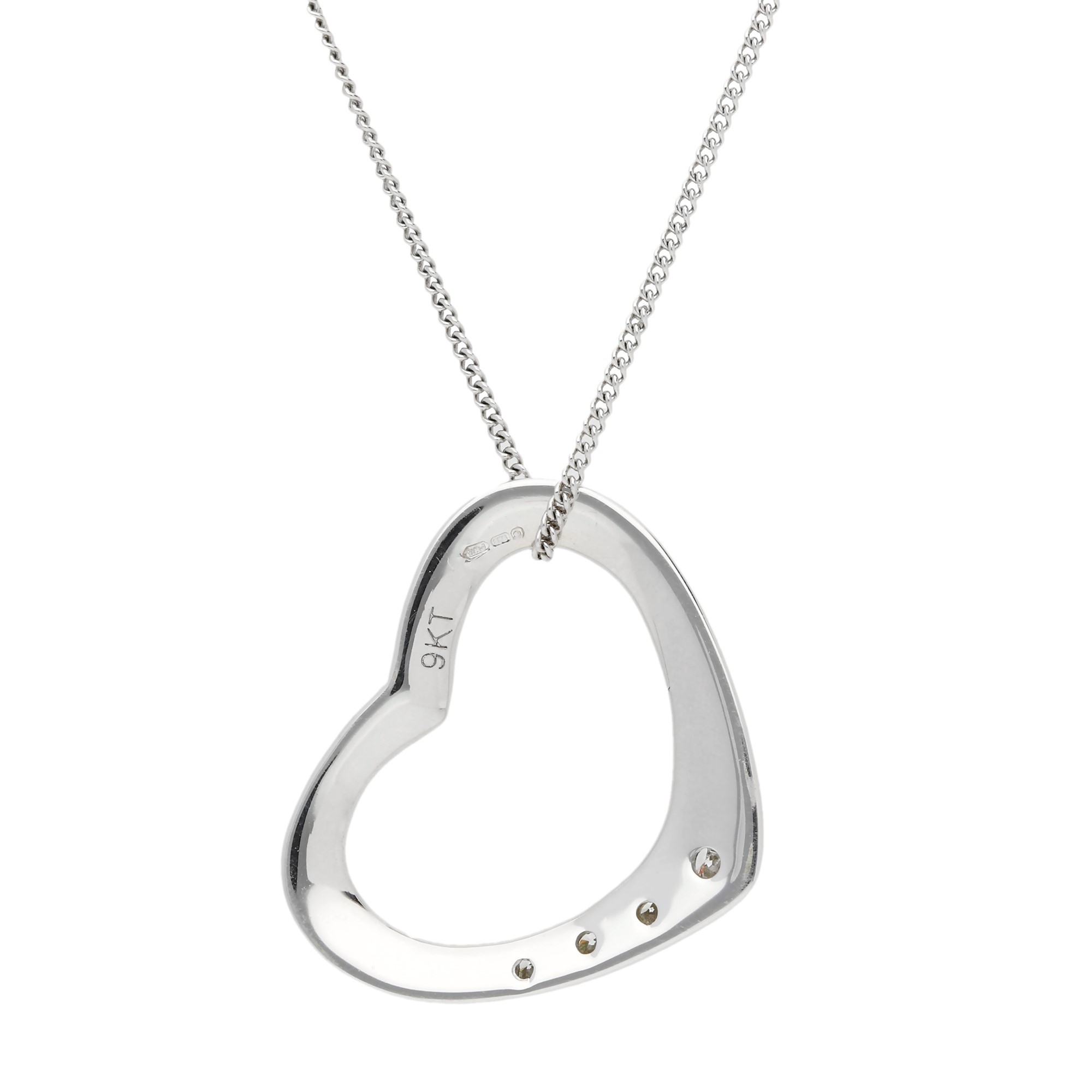 Discover the elegance of our 9ct White Gold Diamond Heart Pendant, a stunning piece that combines modern sophistication with timeless beauty. This exquisite heart shaped pendant is crafted from premium 9ct white gold and is set with four sparkling accent diamonds, adding a touch of glamour and luxury to any outfit. The unique design allows the pendant chain to thread directly through the heart, creating a seamless and elegant look that is both contemporary and classic. Perfect for the discerning woman who appreciates the delicate allure of diamonds and the sleek appeal of white gold, this necklace is a versatile addition to any jewellery collection. Whether you're dressing up for a special occasion or adding a sophisticated sparkle to your everyday wear, this gold heart necklace is sure to impress. With free UK delivery, gifting this beautiful women's heart necklace or treating yourself has never been easier. Shop now and let our Diamond Heart Pendant be a symbol of your refined taste and style.
