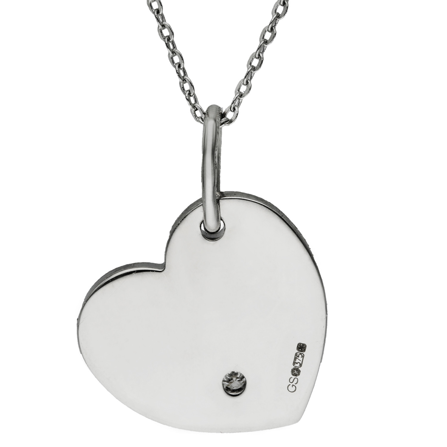 Introducing our elegant 9ct White Gold Diamond Heart Pendant, a fusion of timeless beauty and personal sentiment. This sophisticated pendant features a sleek white gold heart tag, enhanced by a small accent diamond that adds a subtle sparkle to the front, symbolizing love and refinement. Both the back and front have plain spaces, offering a perfect canvas for personal engraving, making it an ideal gift for special occasions or a meaningful addition to your jewellery collection. Crafted with precision from luxurious 9ct white gold, this heart necklace stands out for its classic elegance and the personal touch it invites. Whether you're commemorating a special moment or expressing affection, this white gold heart pendant is a versatile choice, seamlessly complementing any outfit. With free UK delivery, it's easier than ever to add a touch of sophistication to your look. Shop now and make a statement of elegance and personal connection with our Diamond Heart Pendant.
