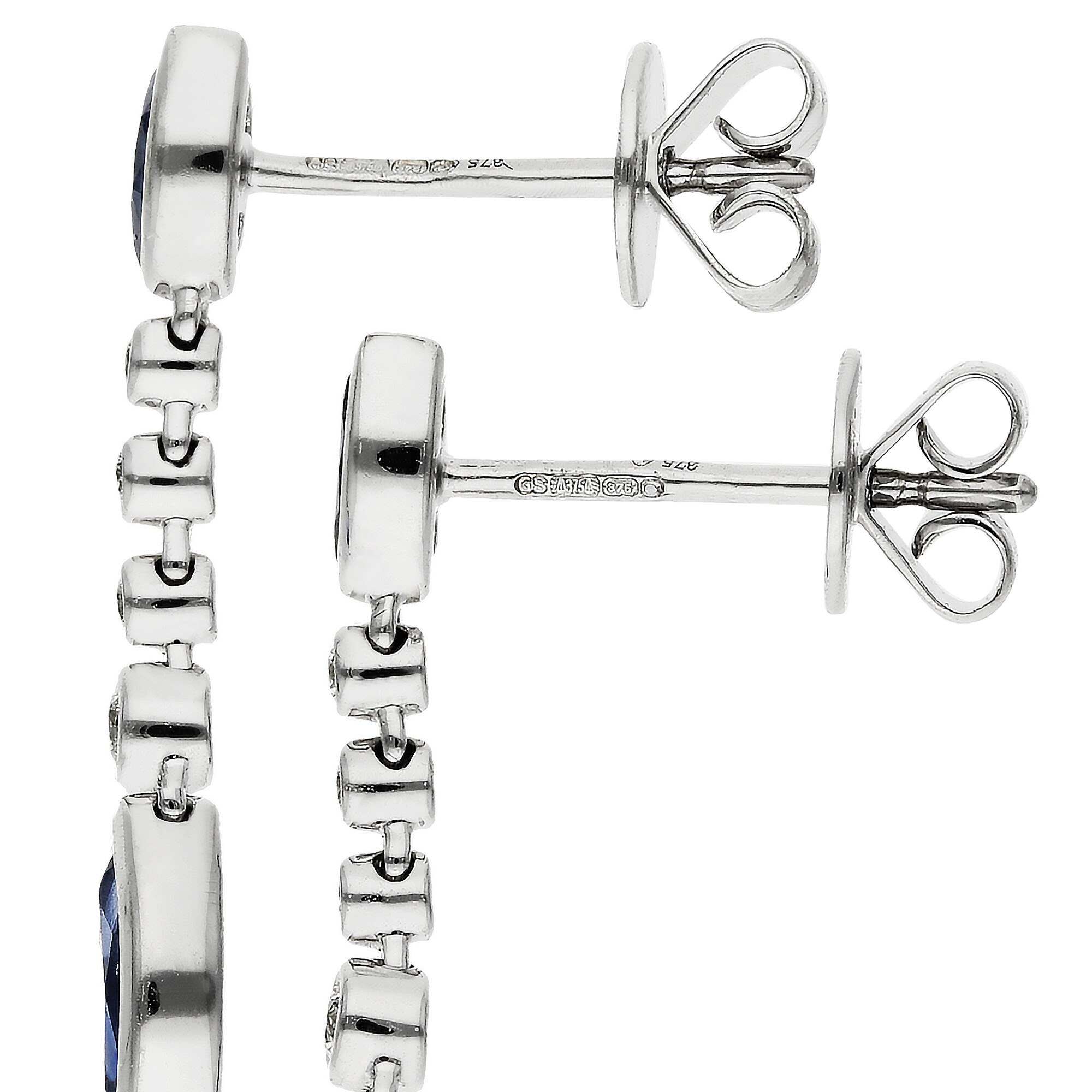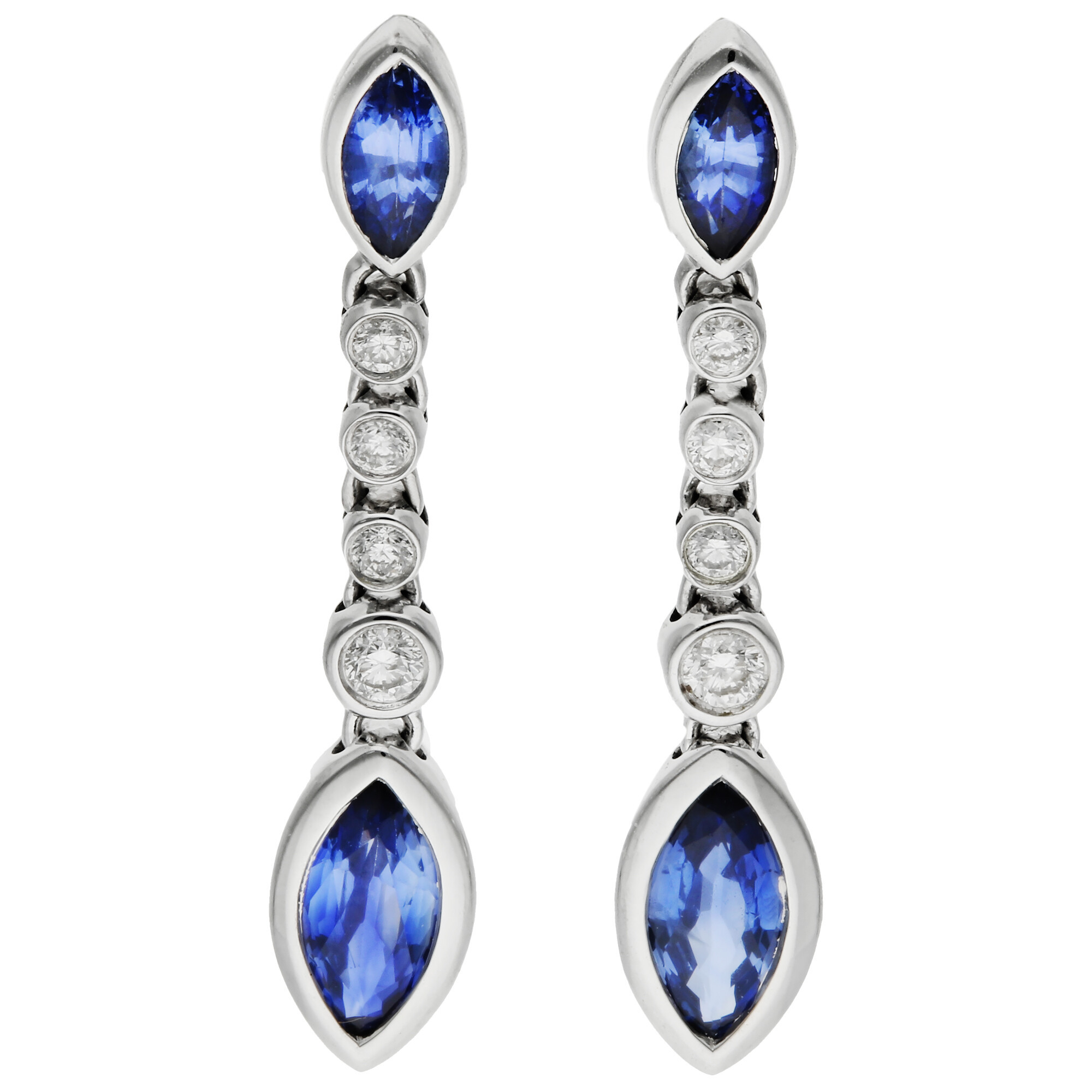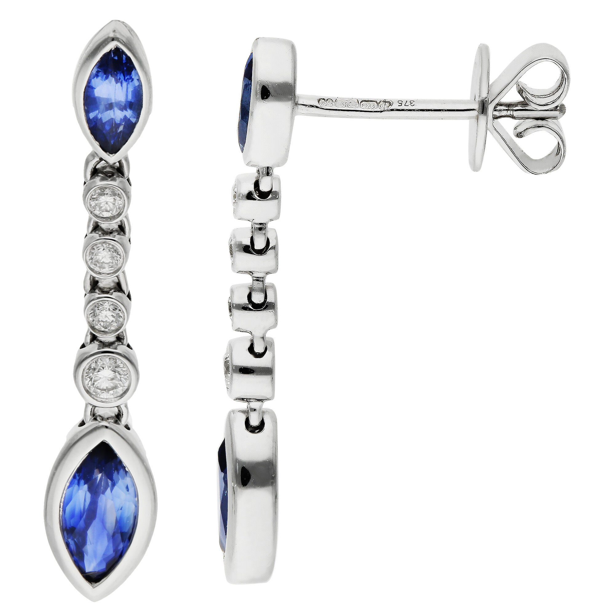 Indulge in the timeless elegance of our 9ct White Gold Diamond and Sapphire Drop Earrings. Each earring is beautifully crafted with two navette shaped sapphires, each securely bezel set to showcase their striking blue colour. Connecting these sapphires is a parade of bezel-set diamonds, providing a seamless transition of sparkle that enhances the overall design. These sophisticated drop earrings are equipped with posts and scroll backs, ensuring a comfortable and secure fit for any occasion. Perfect for adding a touch of luxury to your evening wear, these earrings are designed to impress and enchant, making them an ideal choice for special events or as a cherished gift.