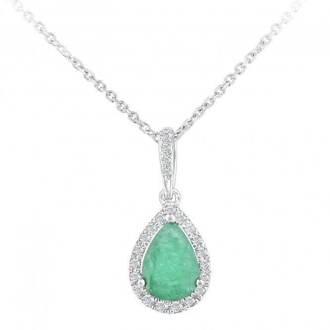 Embrace timeless elegance with our 9ct White Gold Diamond & Emerald Pendant, a stunning piece designed to captivate. This pendant features a vibrant pear shaped emerald, cradled within a sparkling halo of diamonds that enhances the gemstone's natural beauty. Suspended from a diamond set bail, the pendant exudes sophistication and brilliance, making it perfect for both everyday wear and special occasions. Crafted in polished white gold, it comes complete with a matching chain, available in a choice of lengths to suit your style. Whether as a meaningful gift or a personal treasure, this emerald and diamond pendant adds an enduring elegance to any jewellery collection, celebrating the beauty of fine gemstones and craftsmanship.