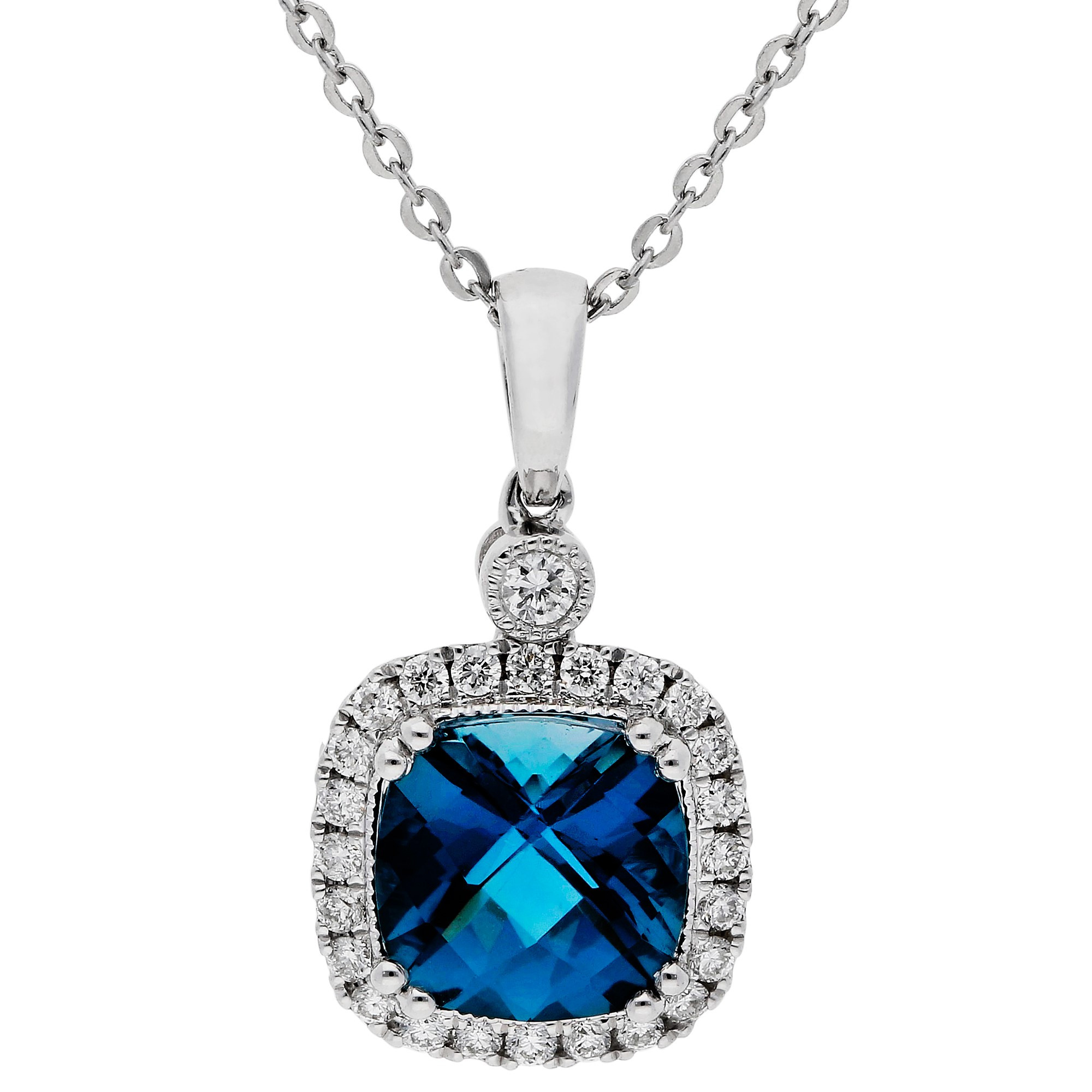 This elegant 9ct white gold pendant showcases a stunning 1.98ct cushion cut London blue topaz, beautifully framed by a halo of sparkling tiny diamonds. The deep blue hue of the topaz is enhanced by the brilliance of the diamonds, creating a captivating contrast. The diamond set surmount adds an extra touch of luxury, while the polished white gold bail and matching chain complete the design. Perfect for both special occasions and everyday elegance, this topaz and diamond pendant is a timeless addition to any jewellery collection, making it a thoughtful gift or a personal indulgence.