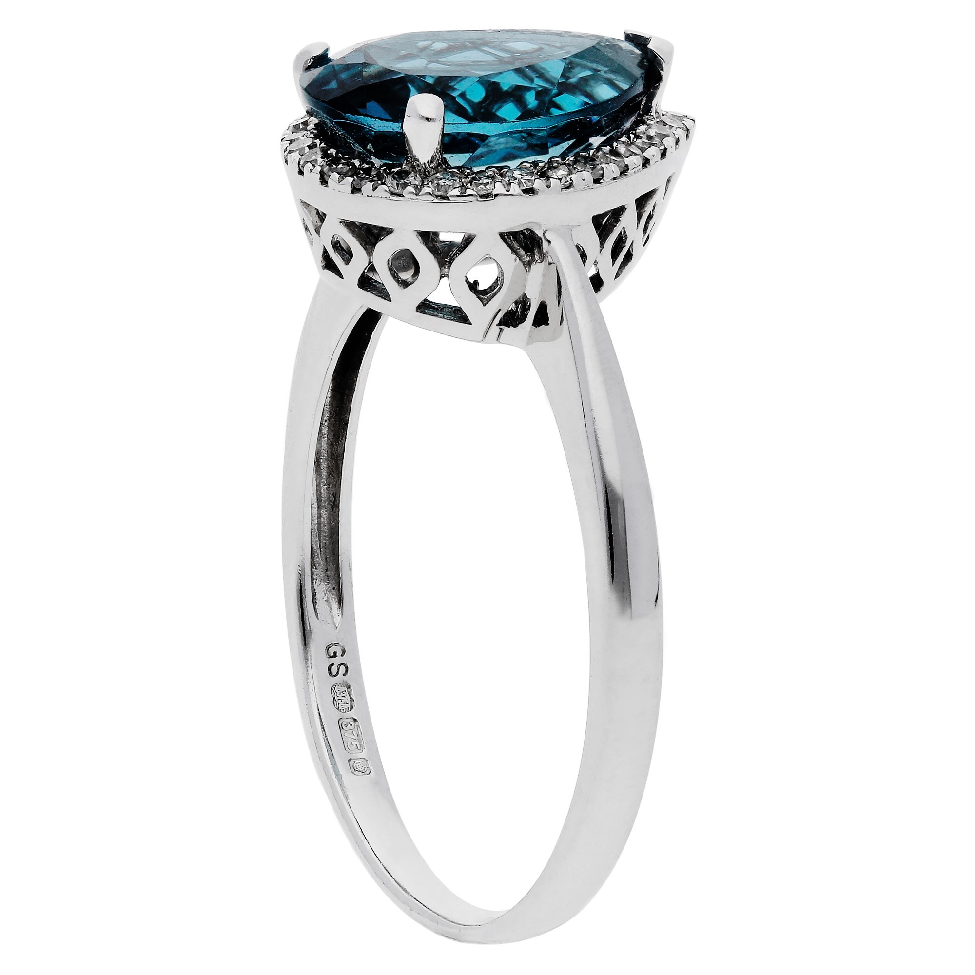9ct White Gold London Blue Topaz & Diamond Pear Shape Halo Ring - O