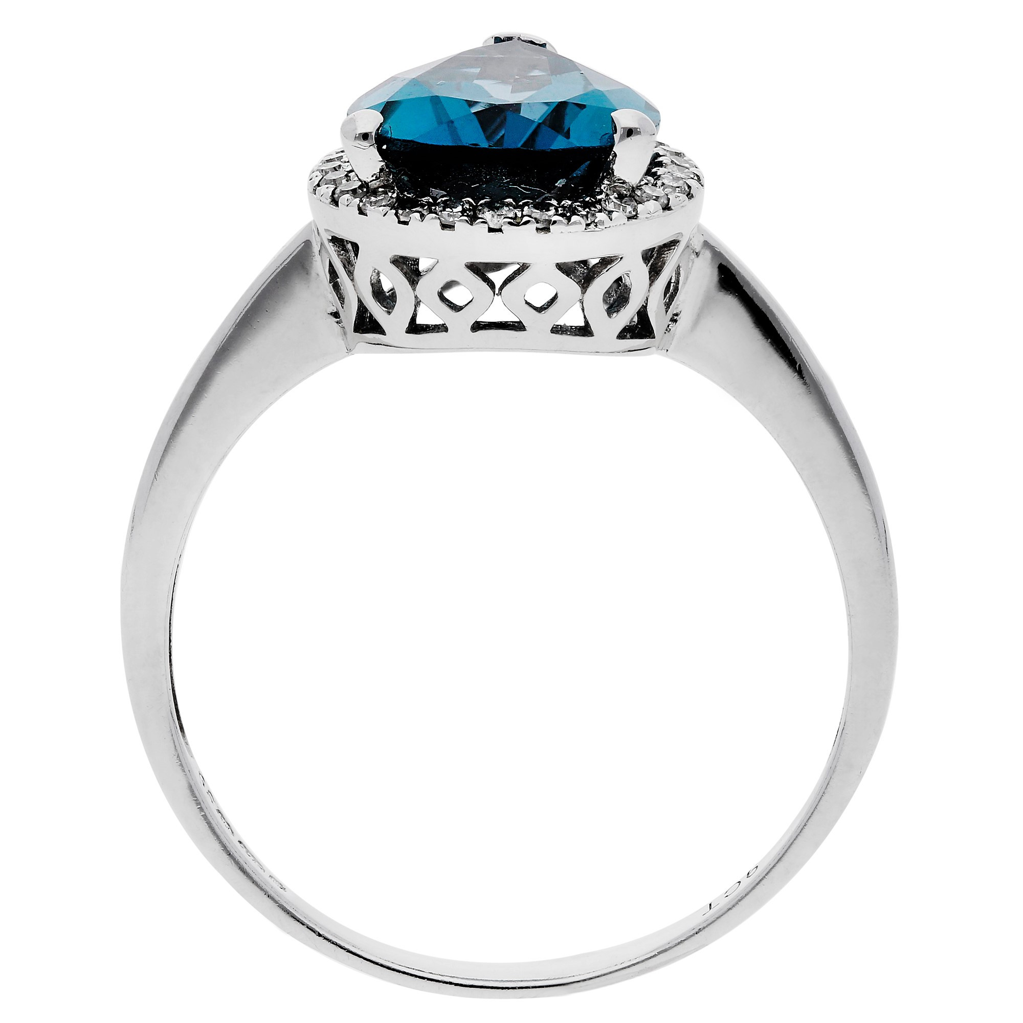 This gorgeous ladies pear shaped halo ring is crafted from 9ct white gold and exhibits a beautiful London blue topaz famed in dazzling diamonds. A big splash of colour and opulence for fancy nights out and a beautiful gift for a November birthday.