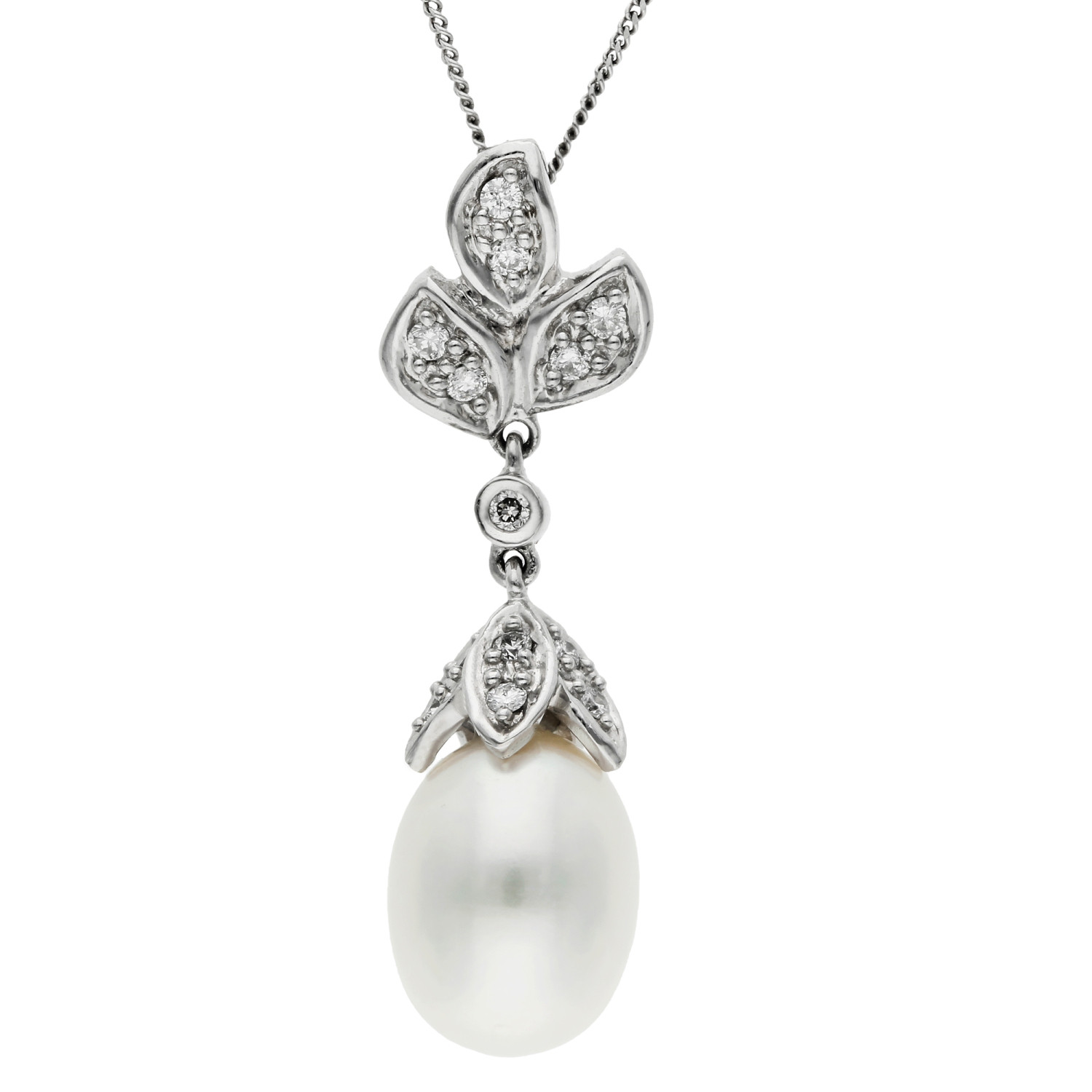Embrace timeless elegance with our 9ct White Gold Diamond & Pearl Pendant, a refined piece that brings classic charm to any collection. This pendant showcases a plump cultured pearl, celebrated for its lustrous beauty, suspended gracefully from a diamond set floral surmount in gleaming white gold. The delicate floral design, adorned with sparkling diamonds, adds a touch of sophistication and charm, making this pendant a versatile accessory for any occasion. The floral charm continues with the diamond set bail and connects seamlessly to a white gold chain, which is available in a choice of lengths to ensure the perfect fit. Whether worn as a luxurious addition to everyday outfits or as a statement piece for special events, this pendant is an exquisite way to bring a touch of elegance to your style. Perfect as a gift or a cherished addition to your own collection.