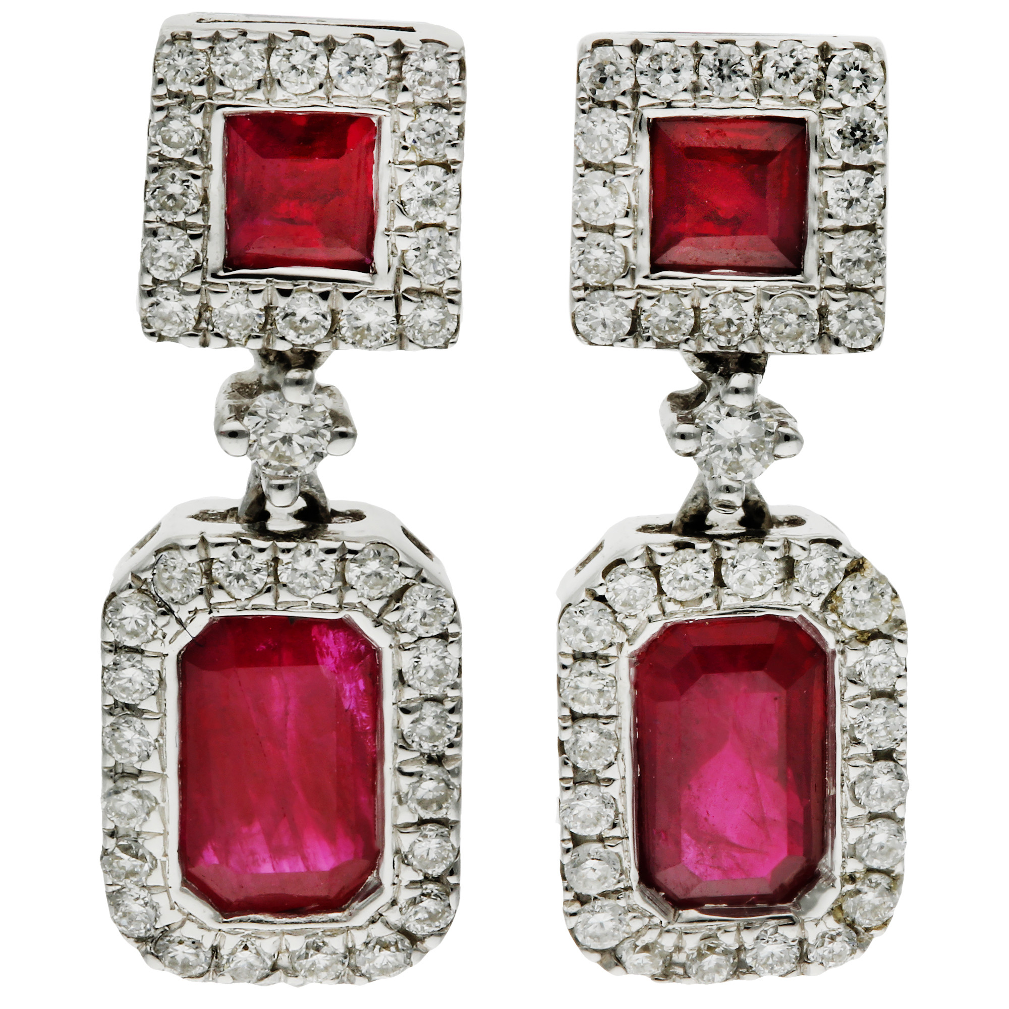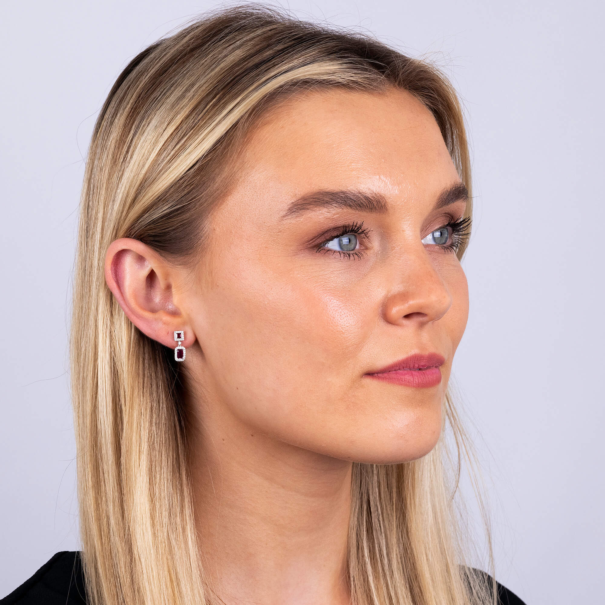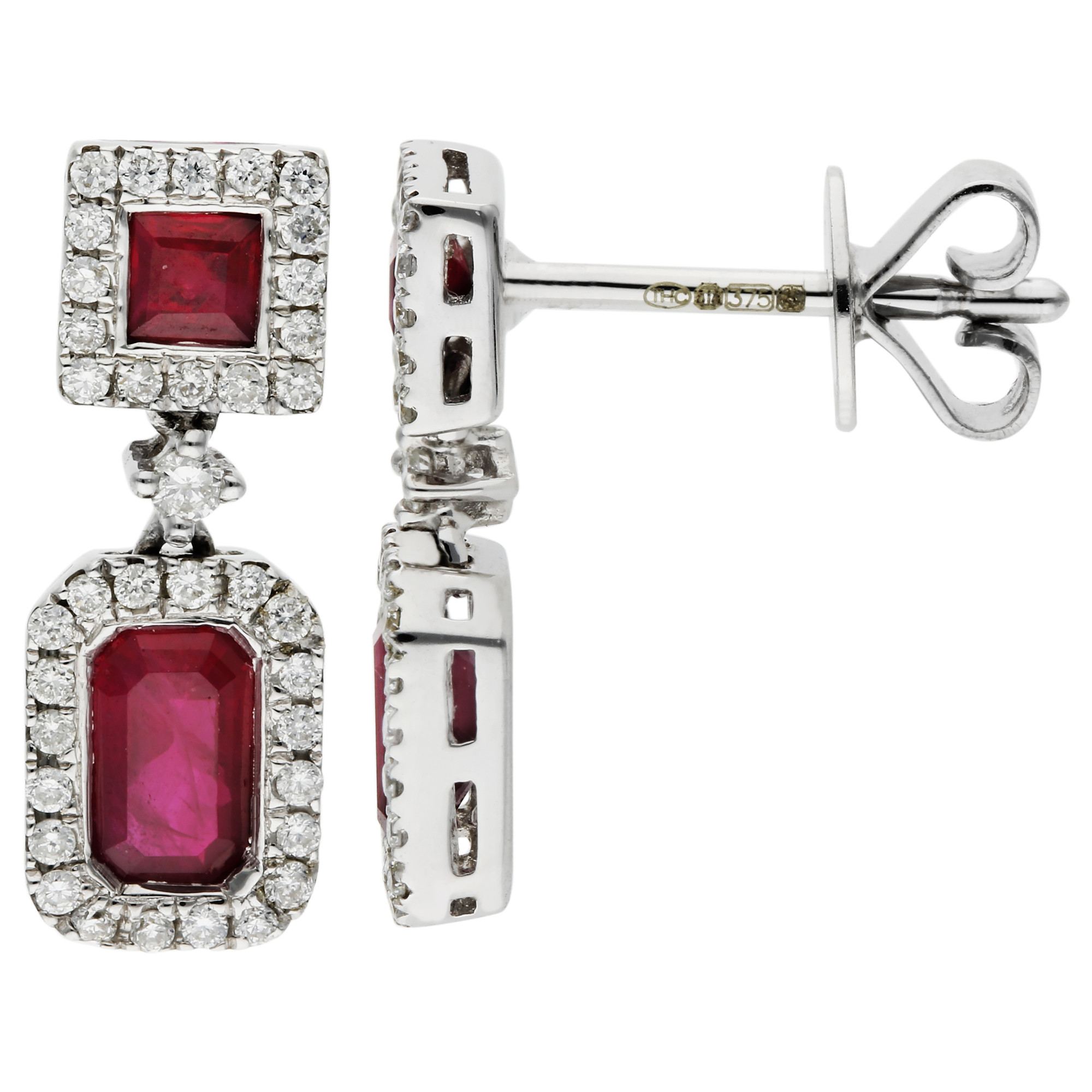 Introducing our exquisite 9ct White Gold Diamond & 0.92ct Ruby Earrings, a stunning display of craftsmanship and elegance. Each earring features a square-cut ruby at the surmount, beautifully framed by a shimmering halo of diamonds. Below, a rectangular-cut ruby, also encased in a diamond halo, dangles gracefully, with a petite diamond nestled between the two stones for added sparkle.
