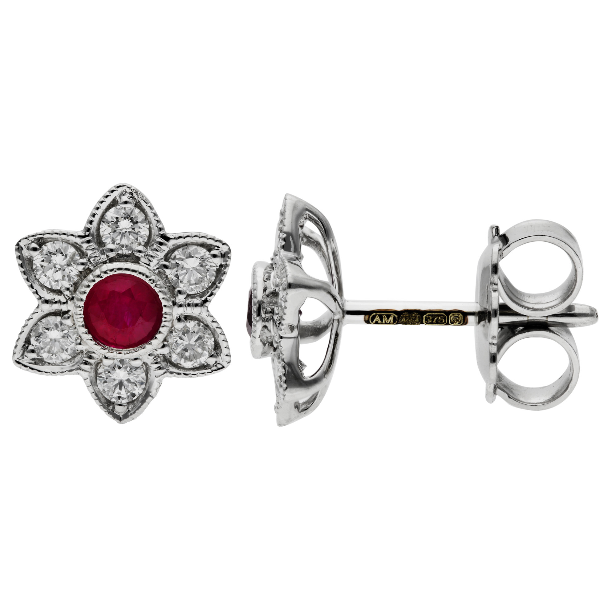 Introducing our exquisite 9ct White Gold Diamond and 0.20ct Ruby Earrings, designed to captivate with their floral elegance. These beautiful women's earrings feature a flower-shaped design with diamond set petals and a central round ruby, all adorned with intricate beaded edging. The sparkling diamonds perfectly highlight the rich red ruby, creating a stunning contrast that enhances the overall appeal. Crafted from 9ct white gold, these earrings offer a total carat weight of 0.20ct for both earrings, ensuring a balanced and harmonious design. Ideal for any occasion, these floral stud earrings add a touch of sophistication to your jewellery collection. Perfect as a gift or a personal indulgence, they embody the perfect blend of classic charm and modern elegance. Elevate your style with the timeless beauty and fine craftsmanship of these stunning diamond and ruby earrings.