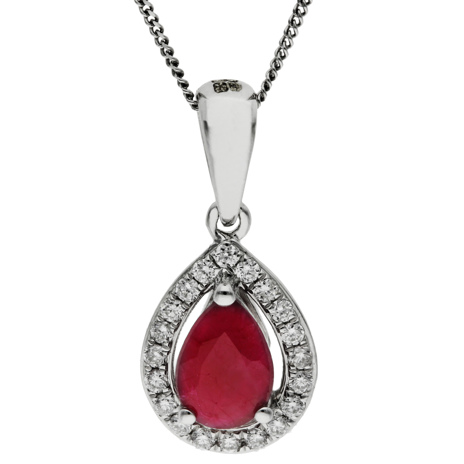 Discover the radiant beauty of our 9ct white gold ruby and diamond pendant. This exquisite piece features a 0.59ct pear shaped ruby, elegantly framed by a halo of shimmering diamonds that accentuate its deep red colour. The pendant is suspended from a polished white gold bail, adding an extra touch of elegance to the overall design. Paired with a sleek white gold chain, this pendant is a perfect choice for anyone looking to add a statement piece to their collection. Ideal for special occasions or as a luxurious gift, this ruby pendant is sure to bring a sparkle to the eye and warmth to the heart.