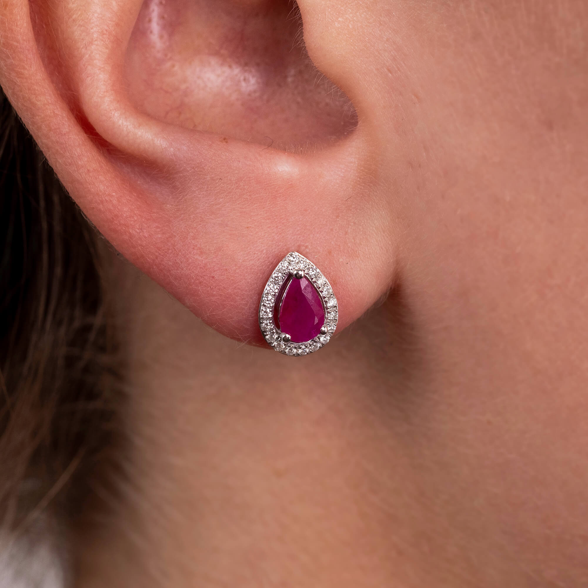 Elevate your elegance with our 9ct White Gold Diamond and 0.96ct Ruby Stud Earrings. Each earring features a stunning pear shaped ruby, framed by a halo of sparkling diamonds that enhance its vibrant red hue. Crafted in luxurious white gold, these women's earrings offer a timeless and sophisticated look. Designed with secure posts and scroll backs, they ensure comfortable and reliable wear. Perfect for any occasion, these stud earrings seamlessly blend classic charm with contemporary style. Add a touch of refined luxury to your jewellery collection with these exquisite 9ct white gold diamond and ruby earrings, designed to make a statement.