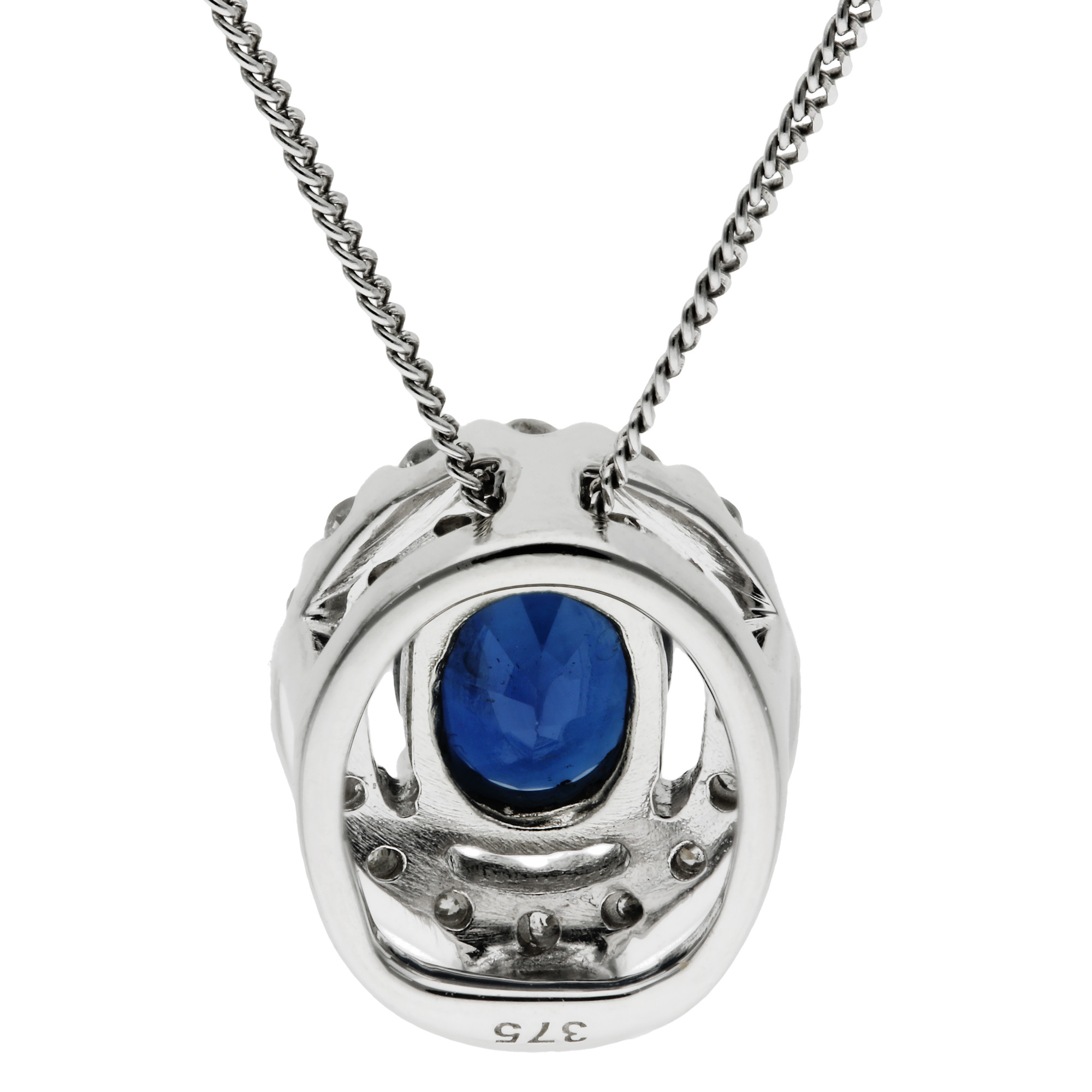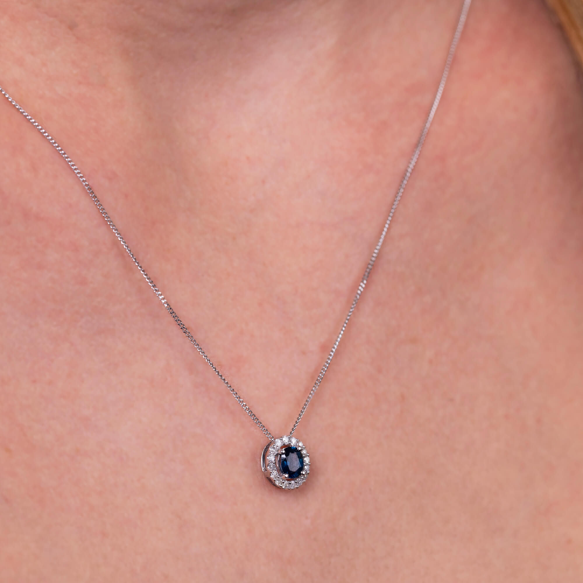 Discover the epitome of luxury with our ladies 9ct White Gold Sapphire and Diamond Cluster Pendant. This exquisite piece is a stunning showcase of elegance and sophistication, perfect for those who appreciate fine jewellery with a timeless appeal. The pendant features a captivating deep blue sapphire, surrounded by a sparkling halo of brilliant cut diamonds, all set in lustrous 9ct white gold. The contrast between the rich sapphire and the radiant diamonds creates a breath taking visual effect, making this pendant a true statement piece.
