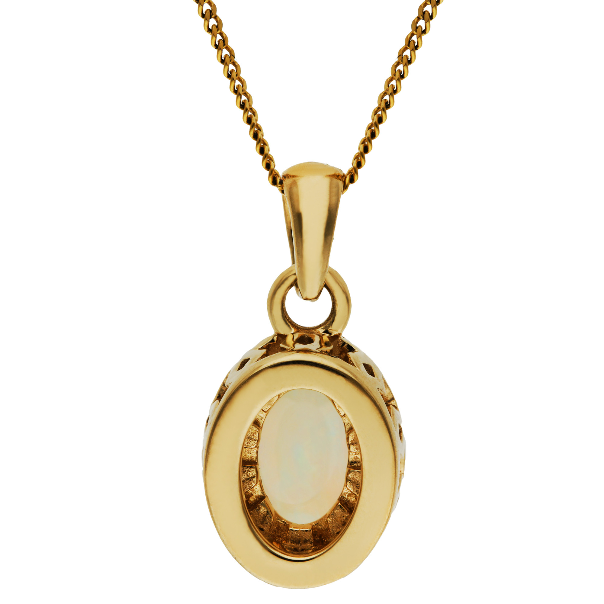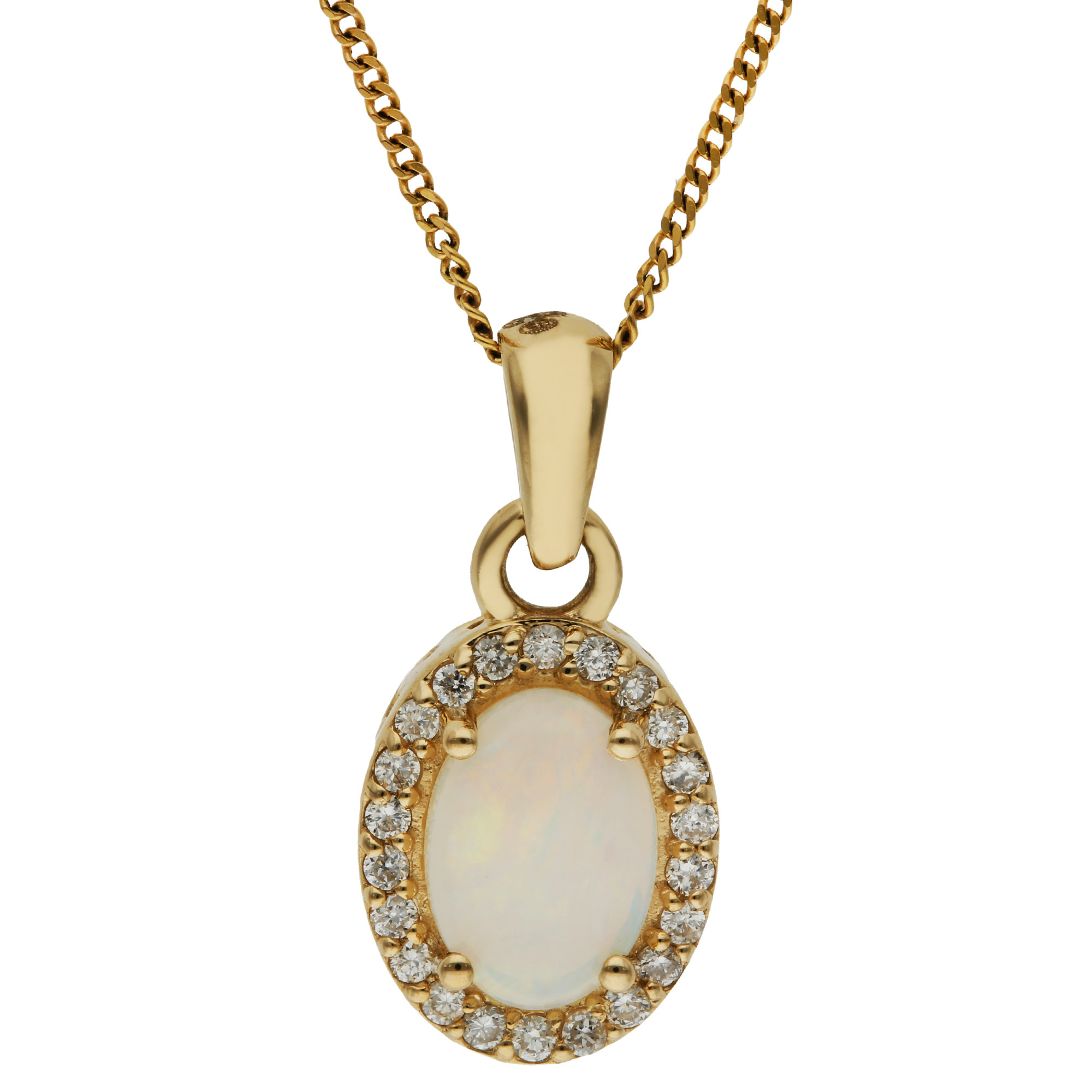 Revel in the enchanting allure of our 9ct yellow gold pendant, featuring a mesmerising 0.60ct oval opal cabochon. This exquisite gemstone is celebrated for its play of colour, showcasing a spectrum that captures the imagination. Framed by a halo of sparkling diamonds, the opal's natural beauty is enhanced, making it a standout piece in any jewellery collection. Suspended from a polished bail and accompanied by a complementary yellow gold chain, this pendant offers timeless elegance. It is perfect for those who appreciate the unique qualities of opal, making it an ideal gift for special occasions or a luxurious addition to your everyday style.
