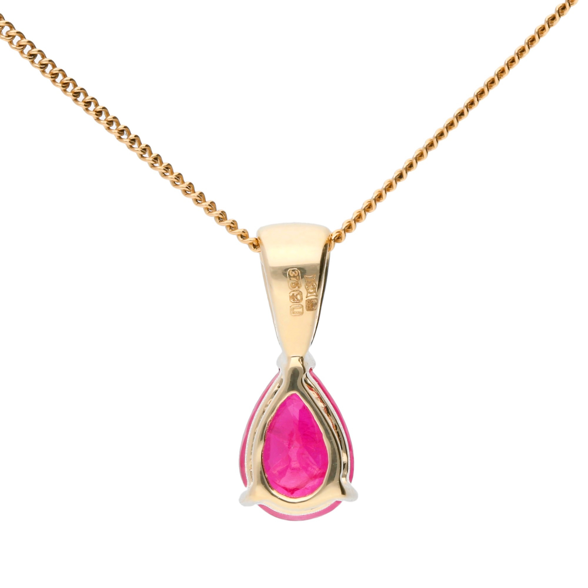 Enhance your jewellery collection with the classic elegance of our 9ct Yellow Gold 0.75ct Ruby Pendant. This beautiful pendant features a pear shaped ruby, claw set in warm yellow gold, capturing the ruby’s rich red hue with a timeless appeal. Suspended from a polished fixed bail, the pendant is completed with a matching yellow gold chain. For a personalised fit, choose your preferred chain length from the dropdown menu. Perfect for both special occasions and everyday wear, this ruby pendant adds a refined touch of sophistication and colour to any outfit.