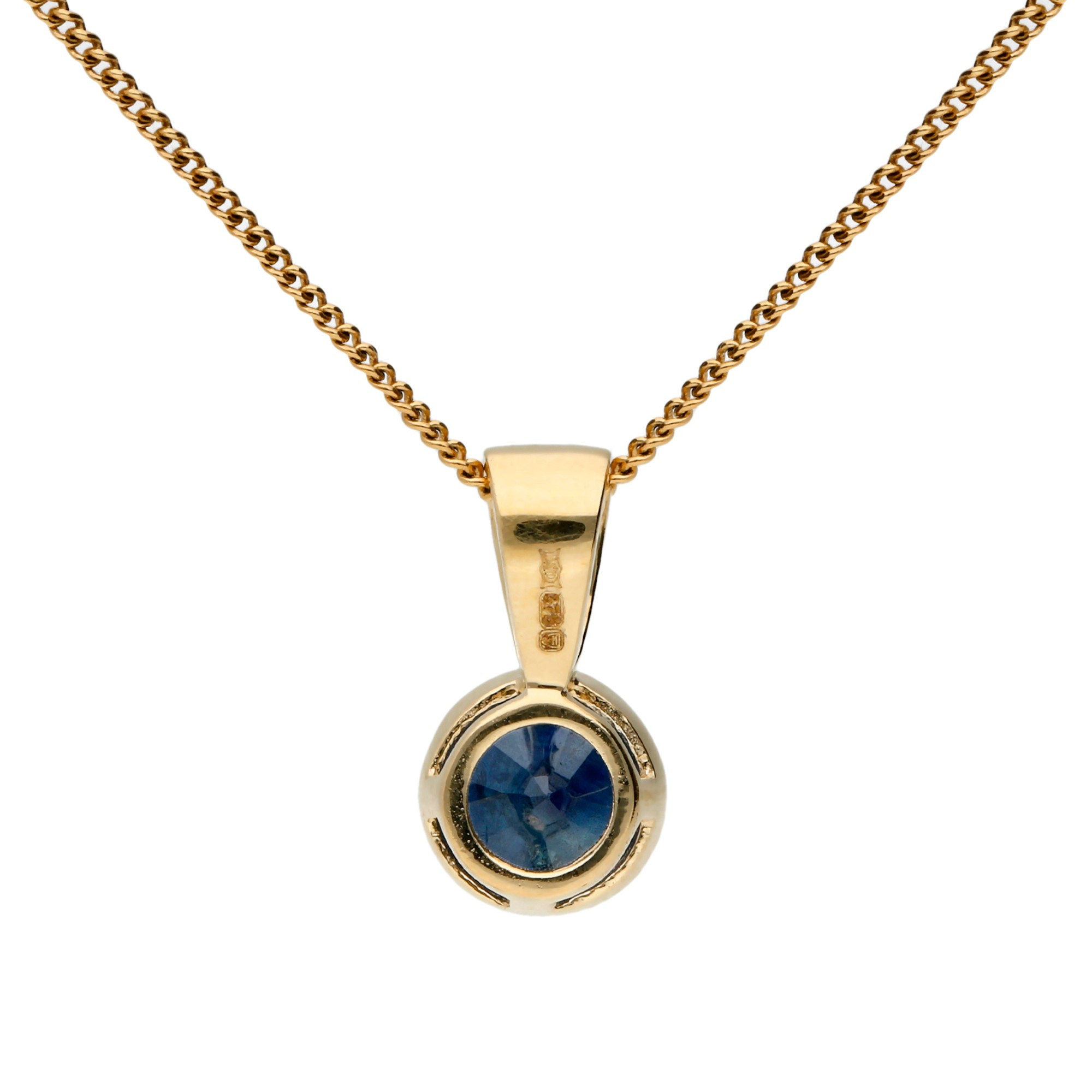 Discover timeless elegance with our 9ct Yellow Gold Sapphire Pendant, a stunning piece that showcases the captivating beauty of a deep blue sapphire. This pendant features a 0.65ct round sapphire, expertly bezel set to highlight its rich hue and sparkle. Held securely on a fixed polished yellow gold bail, the sapphire is perfectly complemented by the warmth of the gold, creating a striking contrast that catches the eye. Complete with a matching chain, this pendant sits gracefully at the neckline, adding a touch of sophistication to any ensemble. Whether given as a thoughtful gift or kept as a personal treasure, this sapphire pendant is a classic choice that blends luxury with understated charm, making it a versatile addition to any jewellery collection.