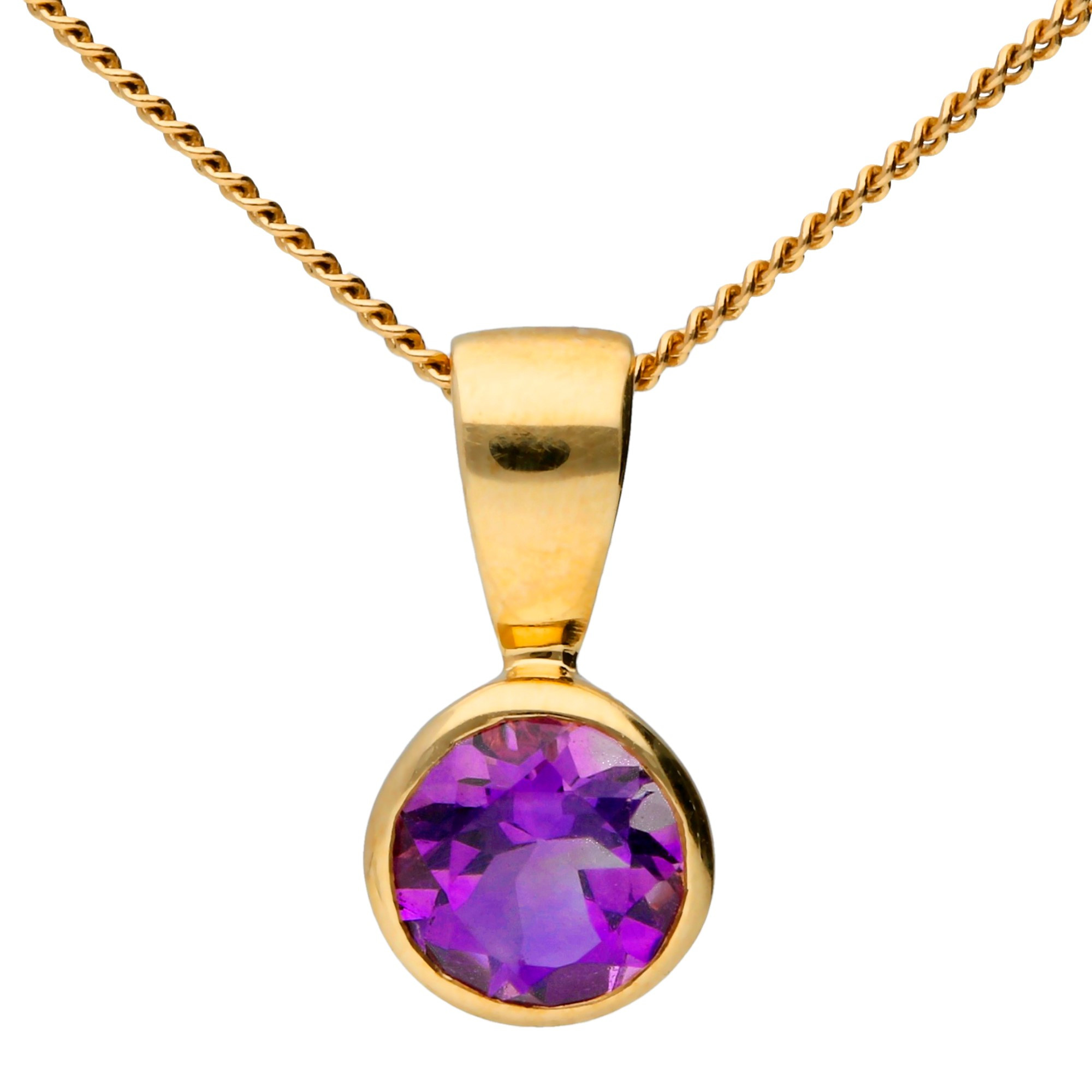 Add a pop of colour to your jewellery collection with our 9ct Yellow Gold Amethyst Pendant, a beautifully crafted piece that highlights the vibrant allure of a deep purple gemstone. This pendant features a 0.45ct round amethyst, elegantly bezel set to showcase its rich hue and natural sparkle. Suspended from a fixed polished yellow gold bail, the amethyst is beautifully contrasted by the warm glow of gold, creating a look that is both timeless and eye-catching. Complete with a matching gold chain, this pendant is designed to sit gracefully at the neckline, making it perfect for everyday wear or special occasions. Whether you are treating yourself or searching for a thoughtful gift, this amethyst pendant offers a refined touch of luxury and elegance.