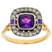 Add a touch of opulence to your collection with this 9ct Yellow and White Gold Diamond and Amethyst Ring. This exquisite piece features a stunning cushion cut amethyst, beautifully bezel set and framed by a sparkling diamond halo enhanced with delicate milgrain detail. On either side, a rectangular cut amethyst adds a striking accent, while three graduated diamonds grace each shoulder for an added touch of brilliance. The combination of yellow and white gold creates a timeless and versatile design, perfect for any occasion. Whether as a thoughtful gift for a February birthday, a Christmas surprise, or an indulgent treat for yourself, this ring offers a luxurious statement with vintage-inspired elegance.