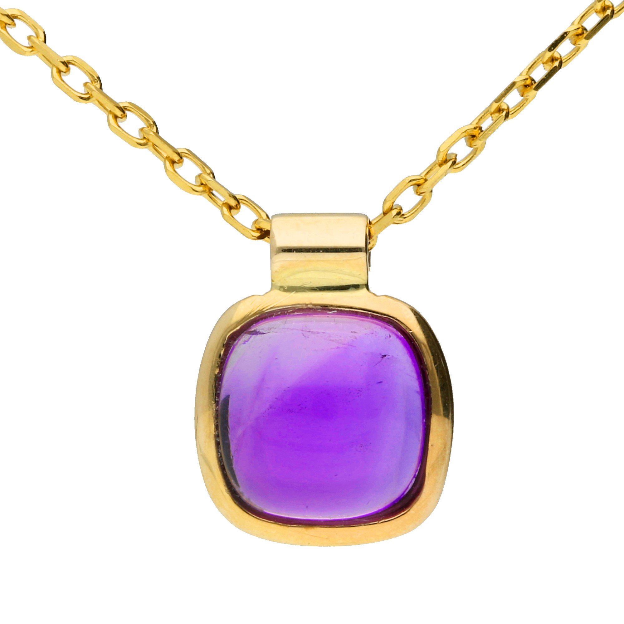 Discover the allure of our 9ct Yellow Gold Amethyst Pendant, a captivating piece designed to add vibrant elegance to any jewellery collection. This pendant features a rich rectangular cabochon amethyst, its deep purple hue beautifully showcased in a smooth yellow gold bezel setting. The contrast between the glowing amethyst and the warm yellow gold setting creates a timeless design that is as versatile as it is stylish. Accompanied by a yellow gold chain, this pendant is perfect for any occasion, adding a touch of refined colour to your look. Whether given as a thoughtful gift or as a personal treat, this amethyst pendant brings a sense of luxury and elegance to everyday style.
