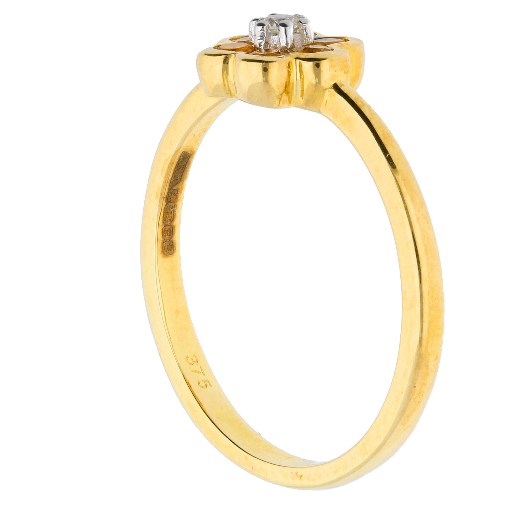A pretty 9ct yellow gold dress ring exhibiting a gorgeous floral design. This beautiful ring is created with warm orange collet set citrines surrounding a claw set sparkling diamond. Perfect for a touch of everyday elegance and a hint of spring time glamour.