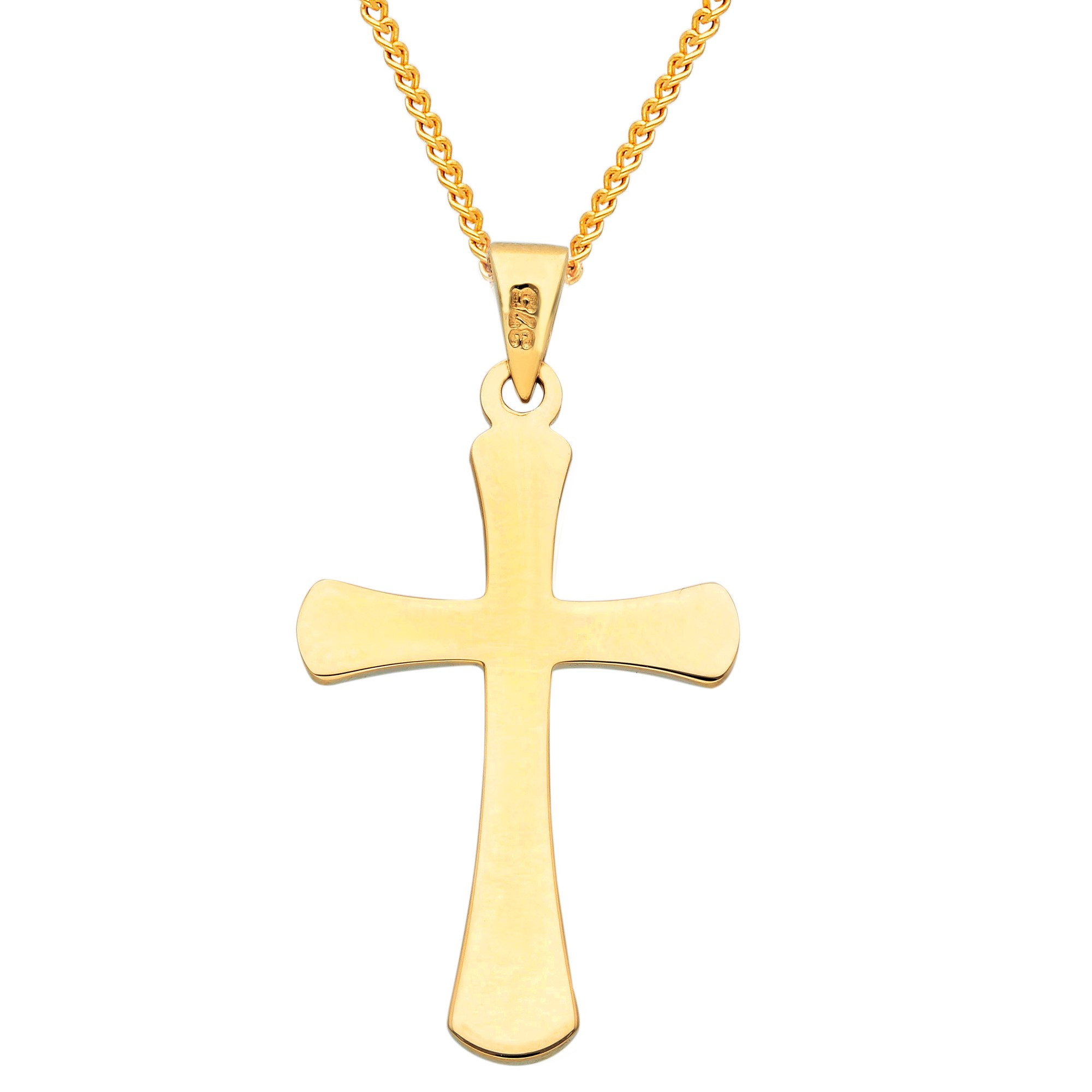 Celebrate timeless elegance with this classic 9ct yellow gold cross pendant. Featuring a sleek and polished design, the cross exudes simplicity and sophistication, making it a versatile accessory for any occasion. Suspended from a polished gold bail, this pendant offers a seamless and elegant look that complements both casual and formal outfits.