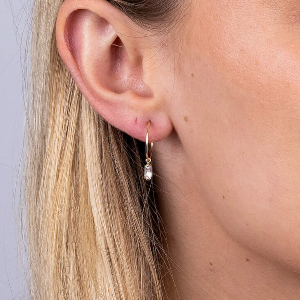 Each hoop features a stunning rectangular cut cubic zirconia charm that dangles gracefully, catching the light with every movement. The sparkling cubic zirconia adds a touch of glamour, making these earrings suitable for both everyday wear and special occasions.