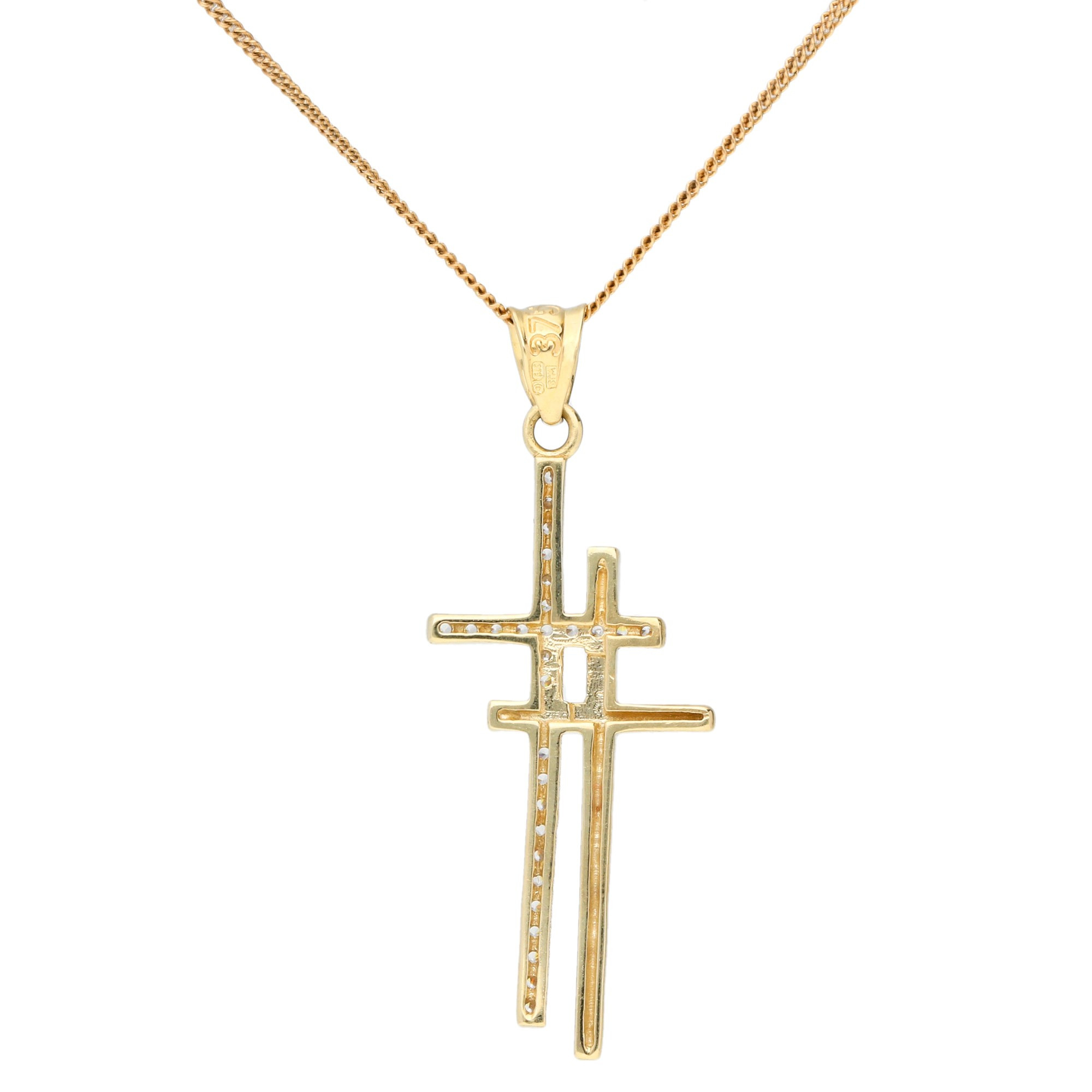 Add a unique and elegant touch to your jewellery collection with this 9ct Yellow Gold Double Cross Pendant. Featuring two overlapping, beautifully crafted crosses, one polished and plain, the other adorned with shimmering tiny cubic zirconias, this pendant combines timeless design with a contemporary twist. The contrasting finishes create a striking and sophisticated look, perfect for any occasion.