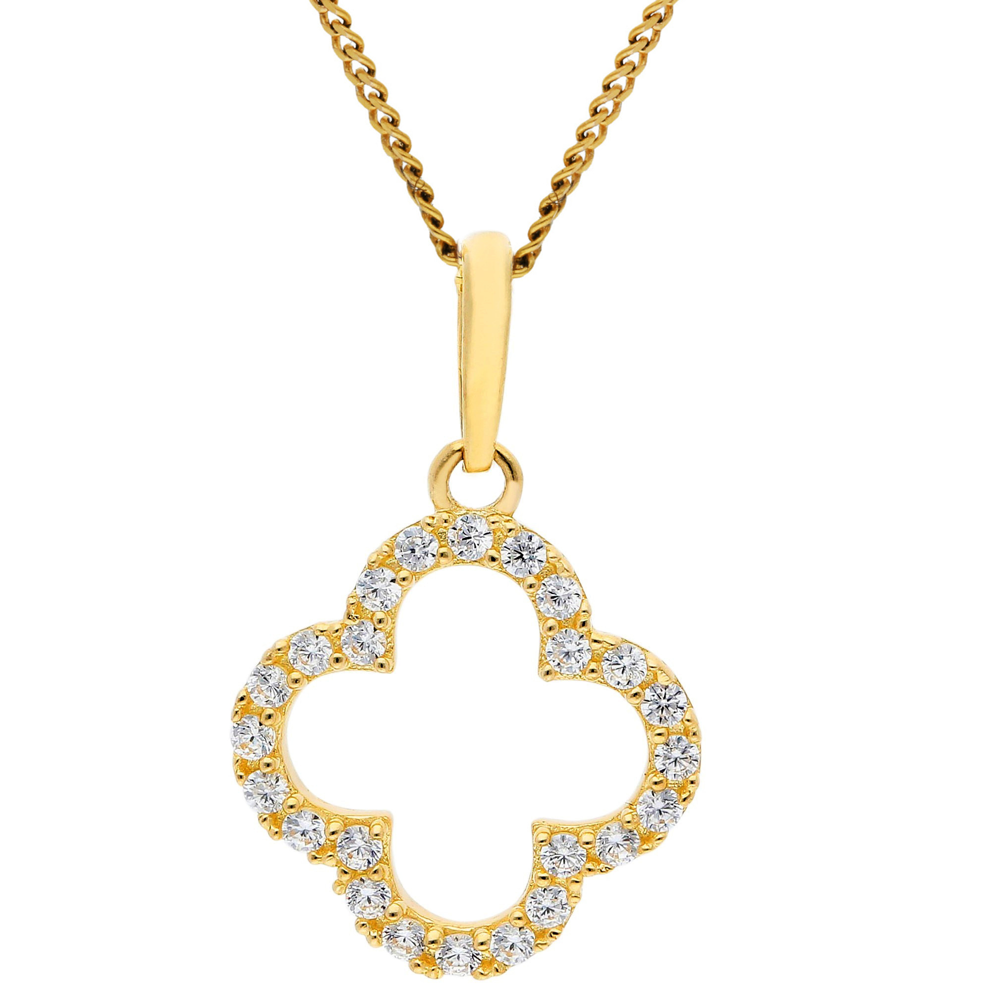 Add a touch of elegance to your jewellery collection with this exquisite Cubic Zirconia and 9ct Yellow Gold Pendant. Crafted in a classic quatrefoil shape, this pendant is adorned with sparkling cubic zirconia stones that radiate brilliance and charm. The polished yellow gold setting enhances the timeless design, creating a sophisticated piece perfect for any occasion.