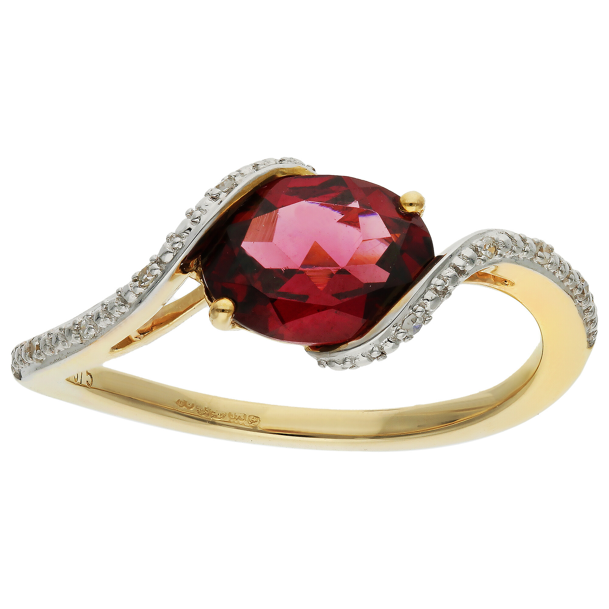 Indulge in the luxurious appeal of this 9ct Yellow Gold Diamond & Garnet Ring, a beautifully designed piece that combines elegance with a touch of sparkle. This exquisite ring features an oval faceted garnet at its centre, securely held in a unique twist of white gold that gracefully encircles the gemstone. The design is further enhanced with a few tiny diamonds that cascade down the shoulders, adding a subtle shimmer that complements the deep red of the garnet. Perfect for those who appreciate a sophisticated blend of colour and light, this ring is an ideal choice for special occasions or as a meaningful gift.