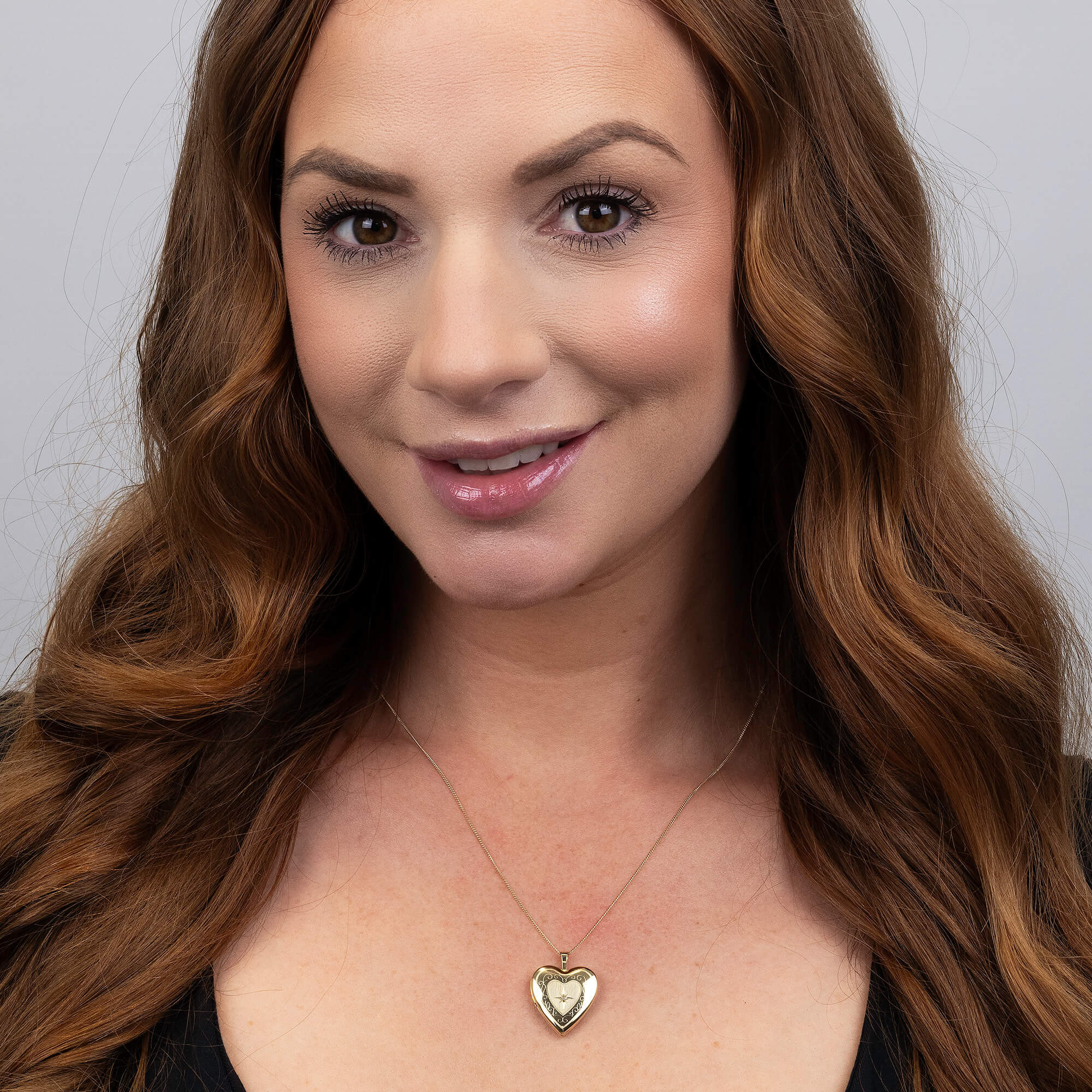 Introducing our charming 9ct Yellow Gold Heart Locket, a beautifully crafted piece that embodies love and elegance. This exquisite locket features a heart-shaped design with a finely engraved pattern on the front, centred with a tiny, sparkling diamond for a touch of sophistication. The back of the locket is adorned with a unique tactile wave design, adding an interesting texture that feels pleasant to the touch. Perfect for storing cherished memories close to your heart, this locket comes complete with a chain, with the option to select the perfect length from the dropdown menu. Whether as a thoughtful gift or a personal keepsake, this heart locket is an ideal choice for those who appreciate intricate detailing and timeless jewellery.