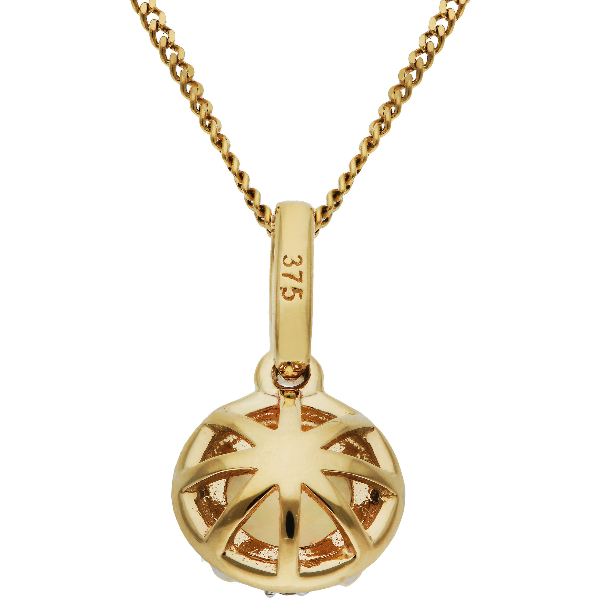 Immerse yourself in the ethereal beauty of this 9ct Yellow Gold Diamond & Opal Pendant, a stunning addition to any jewellery collection. This exquisite piece features a round opal, luminously set with yellow gold claws, and encased in a sparkling frame of diamonds that enhance its iridescent hues. A diamond-set bar bail adds an extra touch of glamour, ensuring this pendant catches the eye with every turn. It comes complete with an 18-inch chain, though other lengths can be selected from the dropdown menu to perfectly fit your style needs. Ideal for those special occasions or as a luxurious everyday accessory, this pendant is sure to dazzle and delight.