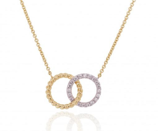Discover the intricate beauty of our 9ct Yellow Gold Diamond Necklace, a stunning piece that elegantly combines classic design with a touch of modern sophistication. This exquisite necklace features two interconnected circles, one with a captivating rope twist design and the other beautifully set with tiny, sparkling diamonds. Each circle complements the other, creating a harmonious blend of texture and shine. The pendant is held on an integral yellow gold chain, ensuring it sits perfectly at the collarbone, making it an ideal accessory for both day and evening wear. Perfect for those who appreciate unique jewellery with a luxurious feel, this necklace is sure to become a cherished part of your collection.