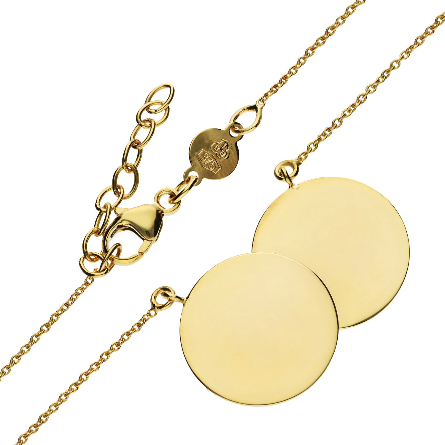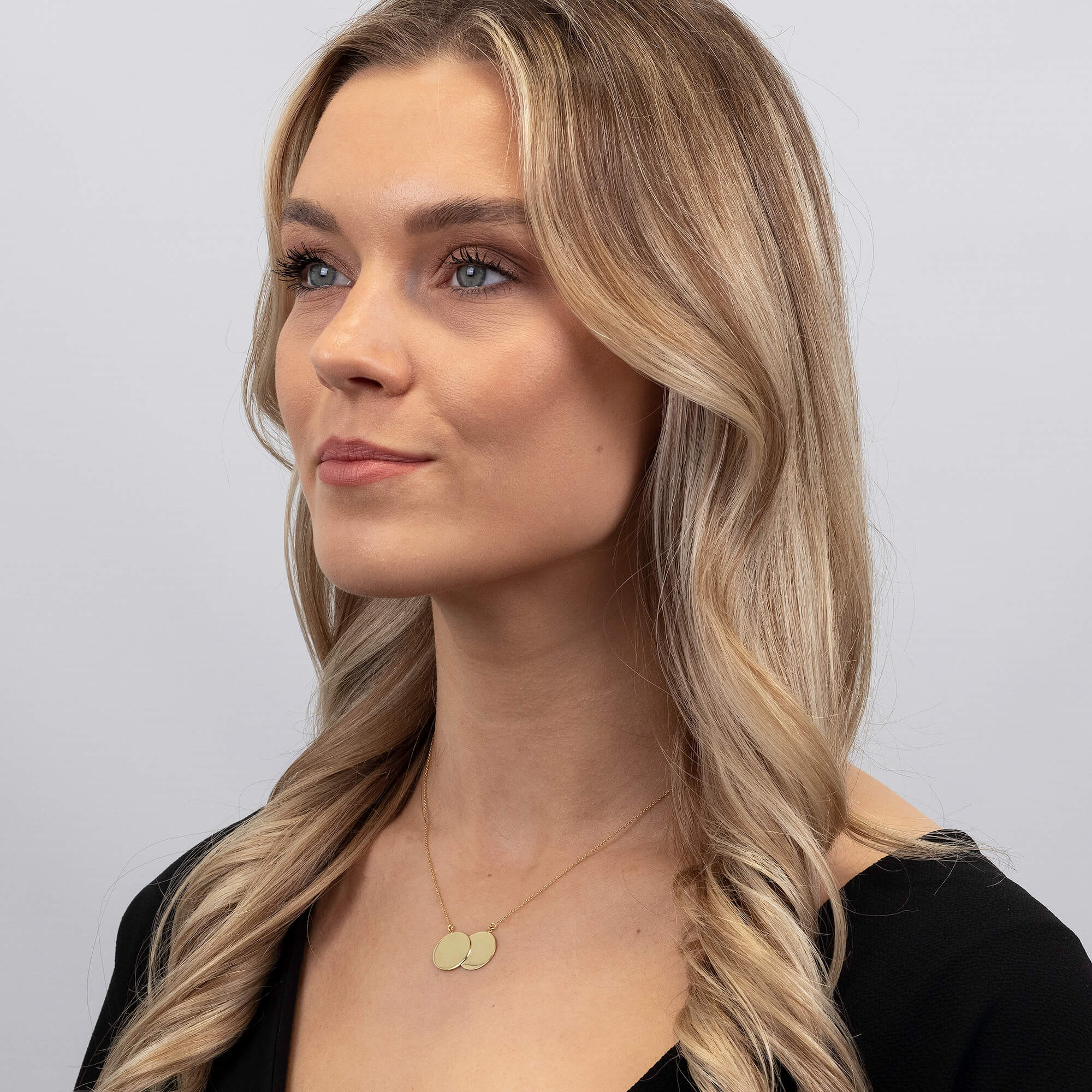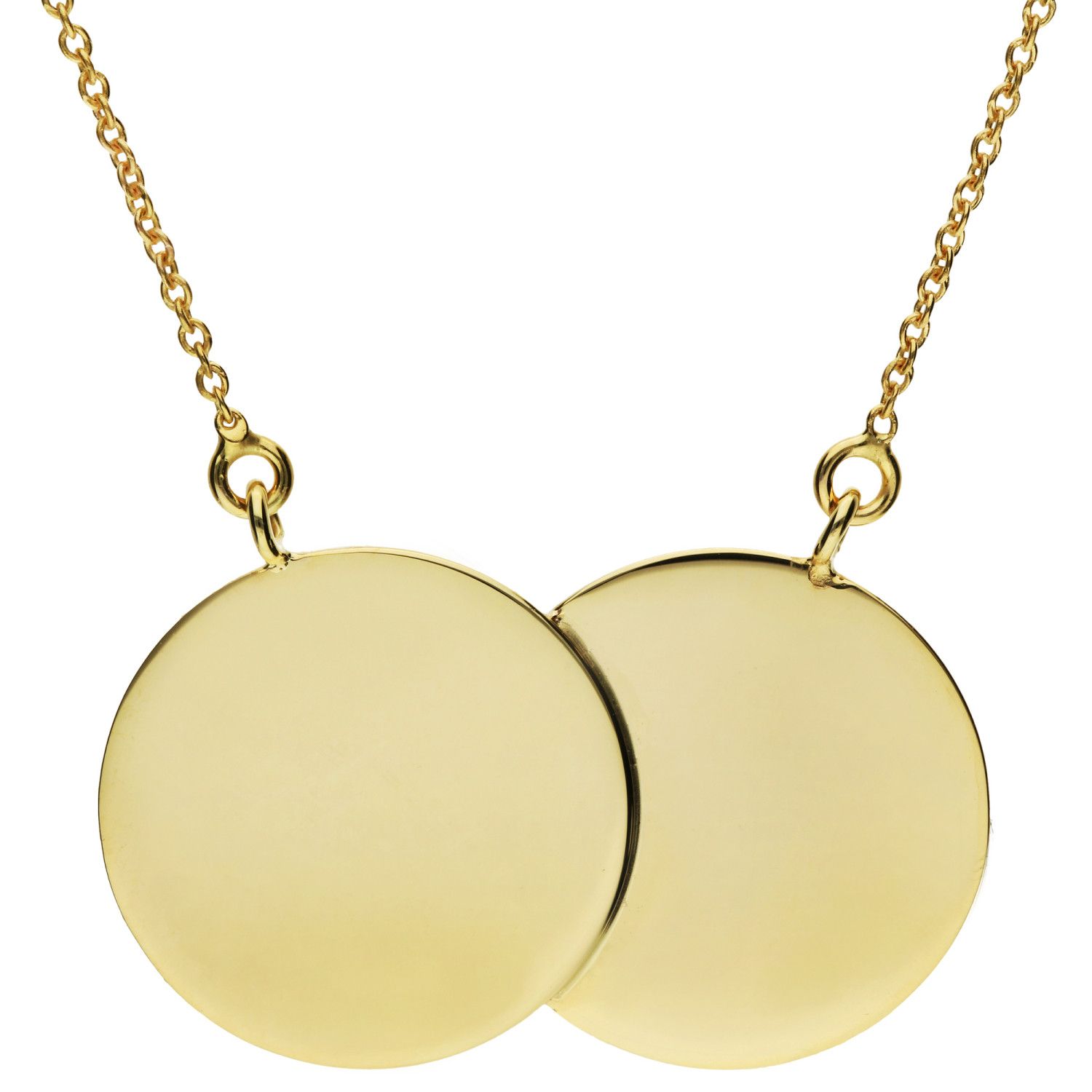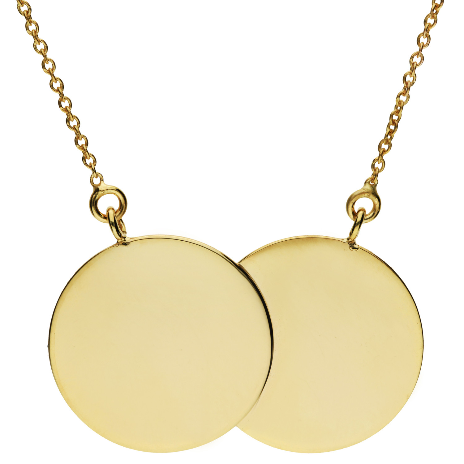 Embrace the elegance of simplicity with our 9ct Yellow Gold Disc Necklace, a beautiful piece featuring two overlapping discs crafted from highly polished yellow gold. The minimalist design offers a timeless appeal, while the smooth surface of each disc makes them ideal for personal engraving, allowing you to add initials, dates, or meaningful messages. Suspended on an integral chain, these discs sit perfectly at the neckline, creating a refined look that complements any outfit. Whether worn on its own for an understated style or layered with other pieces, this necklace is a versatile addition to any jewellery collection. Perfect as a personalised gift or a thoughtful keepsake, this gold disc necklace captures the beauty of fine craftsmanship and the joy of customisation.
