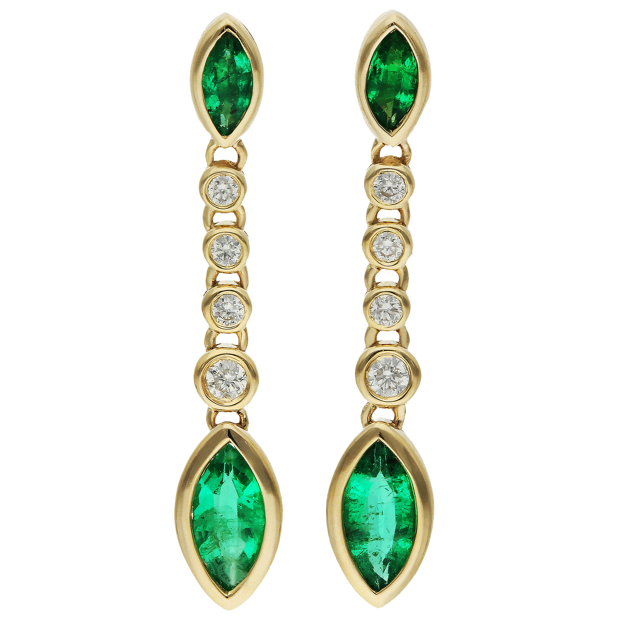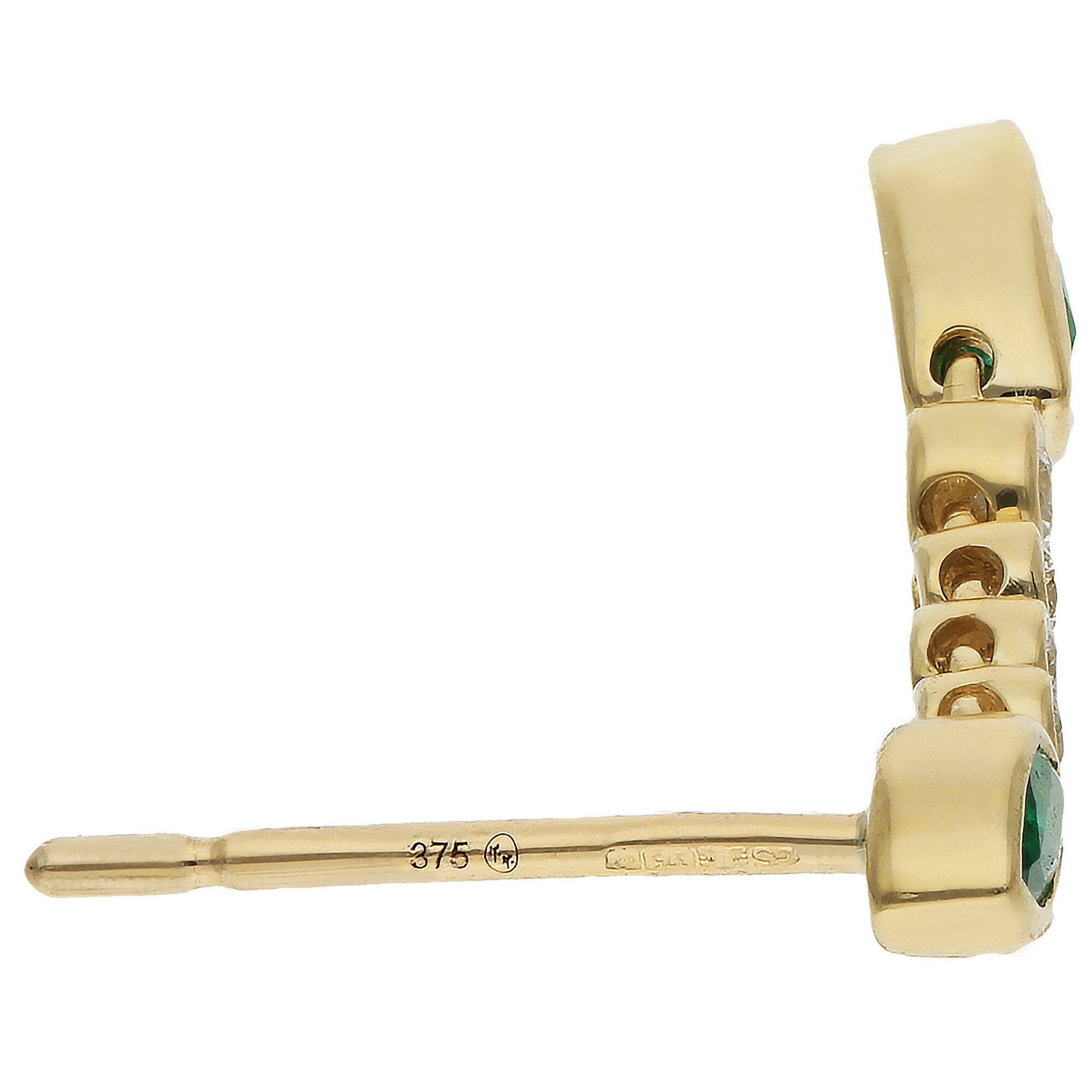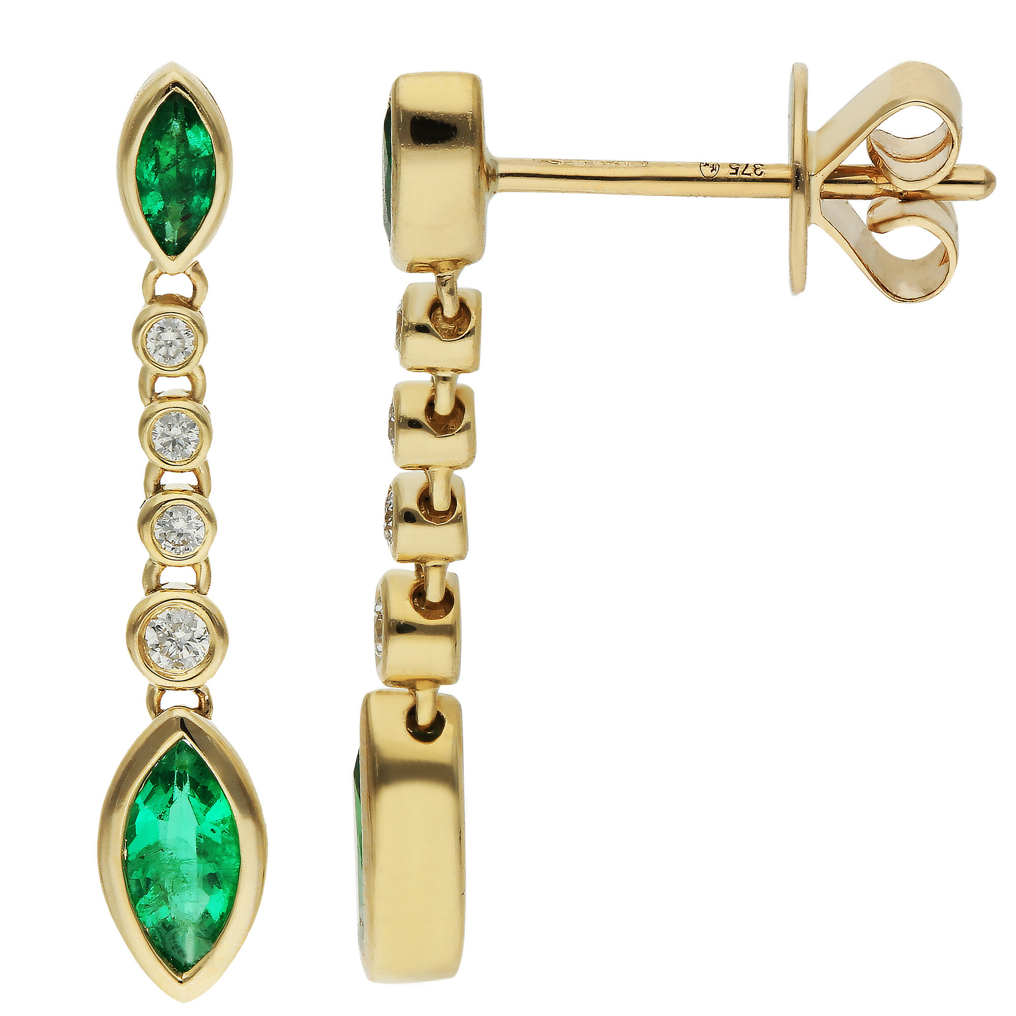 Introduce timeless elegance to your jewellery collection with these stunning 9ct yellow gold emerald drop earrings. Designed with graceful sophistication, each earring features a beautifully cut marquise emerald set in a smooth bezel setting at the top, held securely with a classic post and scroll back. From this vibrant green gem cascades a delicate line of sparkling round diamonds, each one set in its own gleaming bezel to enhance its brilliance and catch the light from every angle. The graduated design leads the eye to a larger marquise emerald at the base, showcasing rich green tones and elegant curves. Crafted in warm yellow gold, these Ladies earrings strike a perfect balance between contemporary style and traditional charm. Ideal as a special gift for birthdays, anniversaries or an unforgettable moment, these drop earrings bring a touch of luxury and colour to any outfit, whether for daywear or evening elegance.