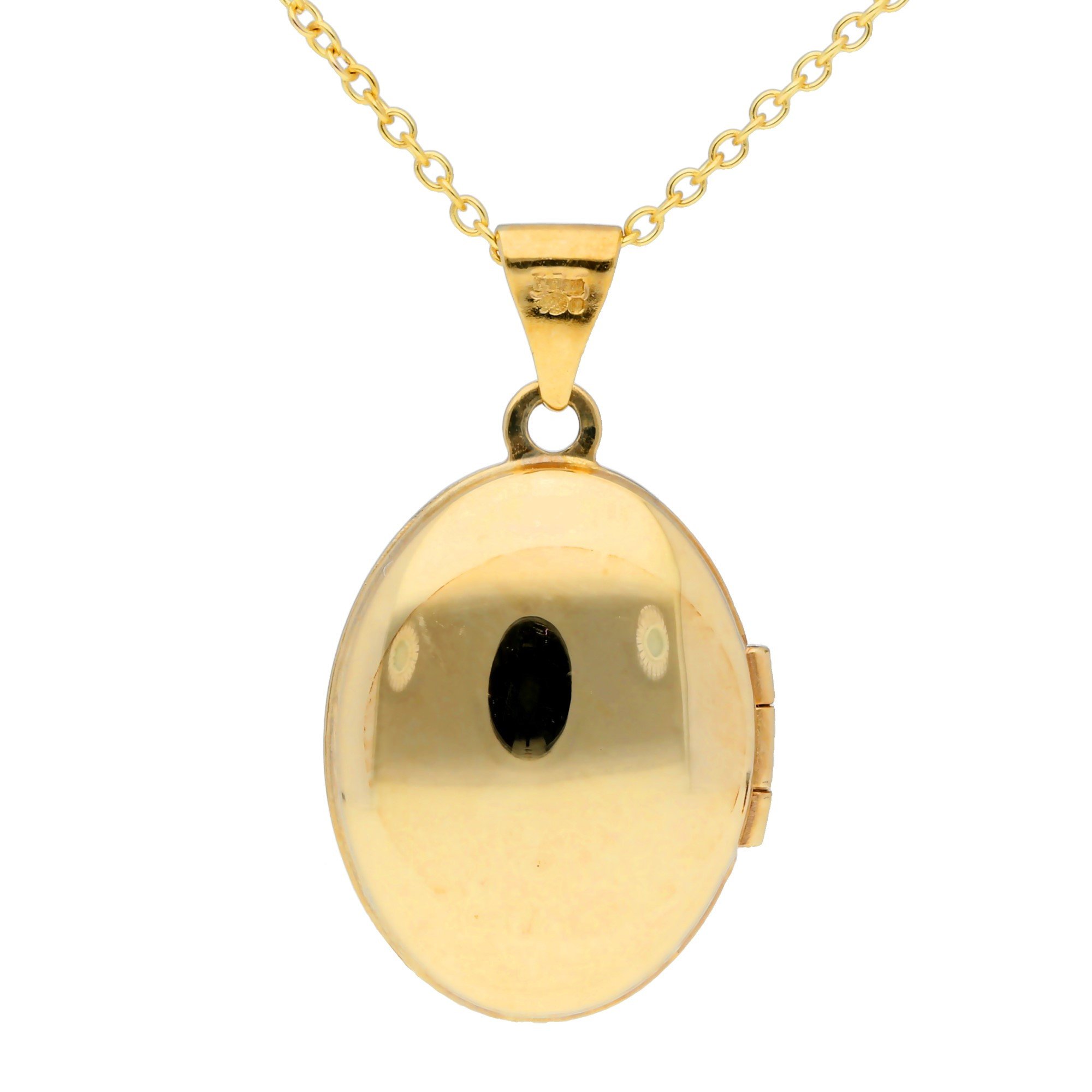 The locket opens to hold a cherished photo or small keepsake, while the reverse side has a polished finish, offering the perfect space for a personalised engraved message. Crafted in radiant yellow gold, the locket is suspended from an 18 inch trace chain, making it easy to wear and suitable for most necklines.