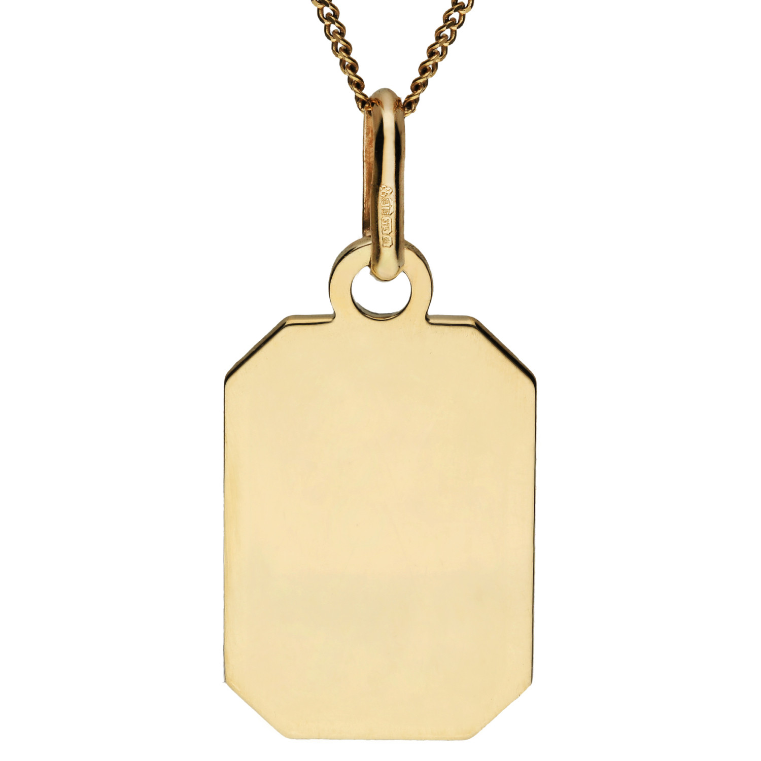 A simple 9ct yellow gold plaque pendant, perfect for engraving. This elegant gold plaque is rectangular octagonal in shape with a simple edge detail and is accompanied by an 18 inch gold curb chain. Wear as a solo pendant. or with other necklaces for this seasons layered look.