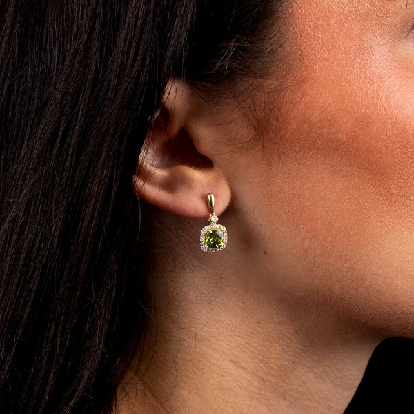 Elevate your elegance with our 9ct Yellow Gold Diamond & 2.25ct Peridot Drop Earrings. Each earring features a stunning cushion cut peridot, beautifully framed with sparkling diamonds and suspended from a simple gold surmount. The vibrant green peridot, totalling 2.25 carats, adds a touch of colour and sophistication, perfectly complemented by the brilliance of the diamonds. Crafted in luxurious 9ct yellow gold, these women's earrings offer a timeless and elegant look. Designed for comfortable and secure wear, these drop earrings are perfect for any occasion, from everyday wear to special events. Enhance your jewellery collection with the captivating beauty of these 9ct yellow gold diamond and peridot earrings and make a lasting impression.