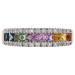 Designed as a half eternity band, encrusted with the perfectly arranged square shape sapphires in varying shades of the rainbow and framed with twinkling diamonds.