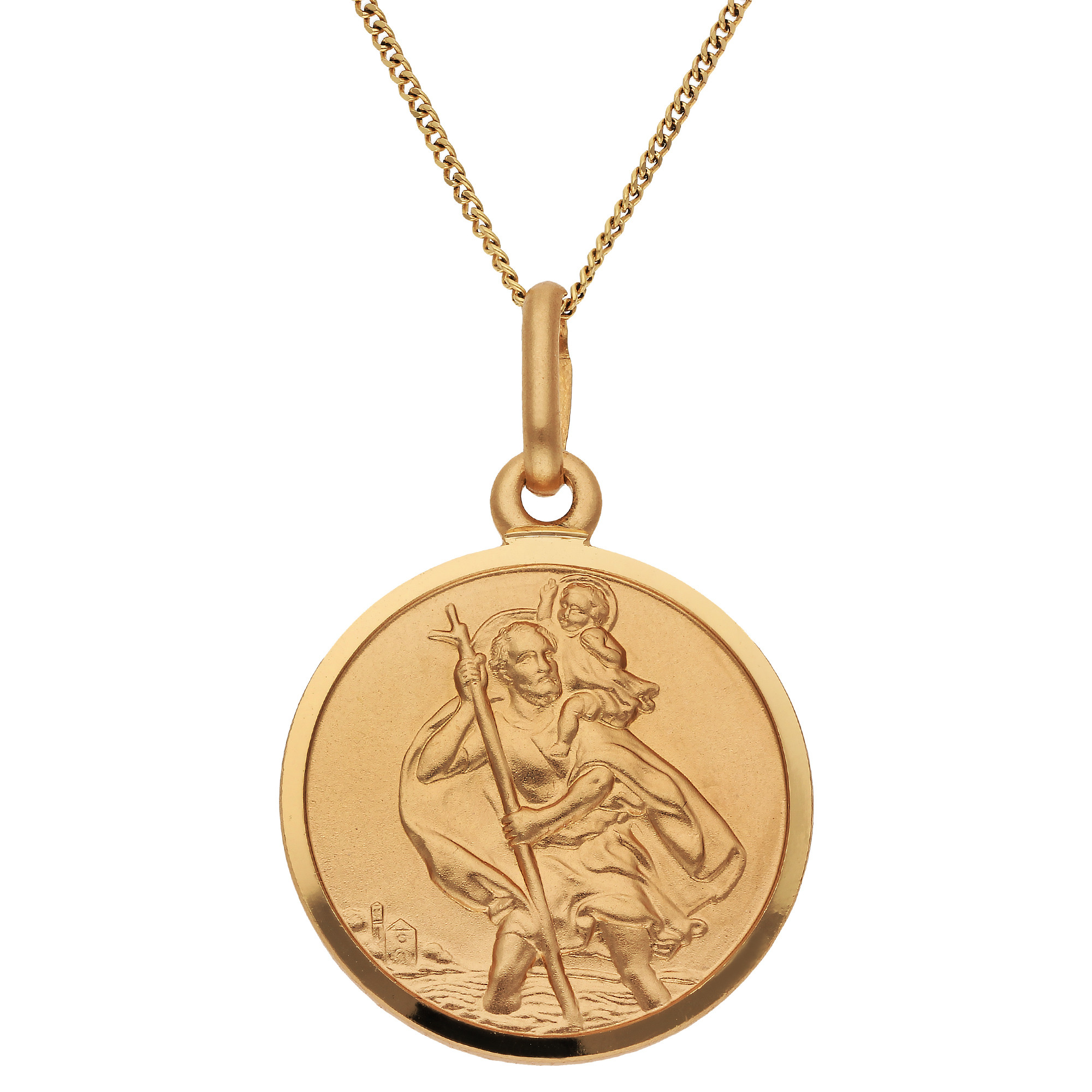 Celebrate faith and safe travels with this elegant 9ct yellow gold round St Christopher pendant, a meaningful piece that is both timeless and comforting. The beautifully detailed design shows the patron saint of travellers carrying the Christ child, offering reassurance and protection wherever life may lead. Crafted in warm yellow gold, it catches the light with a gentle glow that suits everyday wear and special occasions alike. This pendant comes complete with an 18 inch chain, creating a ready to wear gift that arrives with classic style and lasting sentiment. Other chain lengths are available in the drop down menu, allowing you to choose the perfect fit. Ideal as a thoughtful present for birthdays, graduations or milestone moments, it is a popular choice for anyone embarking on new journeys. Its traditional round shape and satin polish finish make it a cherished keepsake that will be treasured for years to come.