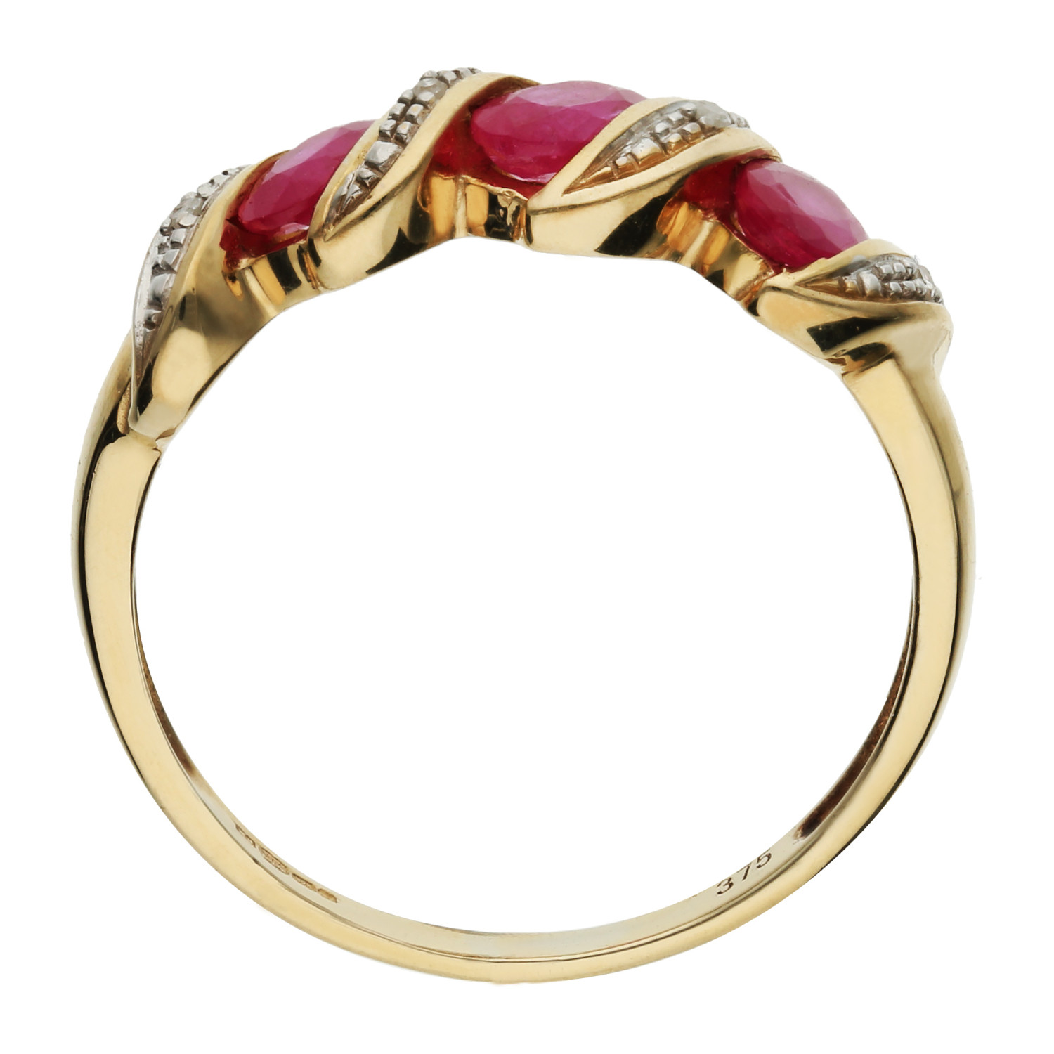 This luxurious 9ct yellow gold ruby and diamond ring is a stunning blend of colour and sparkle, making it the perfect gift for a July birthday. Featuring three vibrant oval cut red rubies, the rich hue of each gemstone is beautifully complemented by twinkling diamonds that are expertly placed between the rubies. The combination of the deep red rubies and the shimmering diamonds creates a striking contrast, adding both elegance and glamour to the design. Crafted in high quality 9ct yellow gold, the band provides a warm and sophisticated finish. This ring is ideal for special occasions, such as a birthday or anniversary, and its festive sparkle makes it perfect for the holiday season. Whether worn as a statement piece or paired with other jewellery, this 9ct yellow gold ruby and diamond ring will catch the light and captivate attention, making it a cherished addition to any jewellery collection.