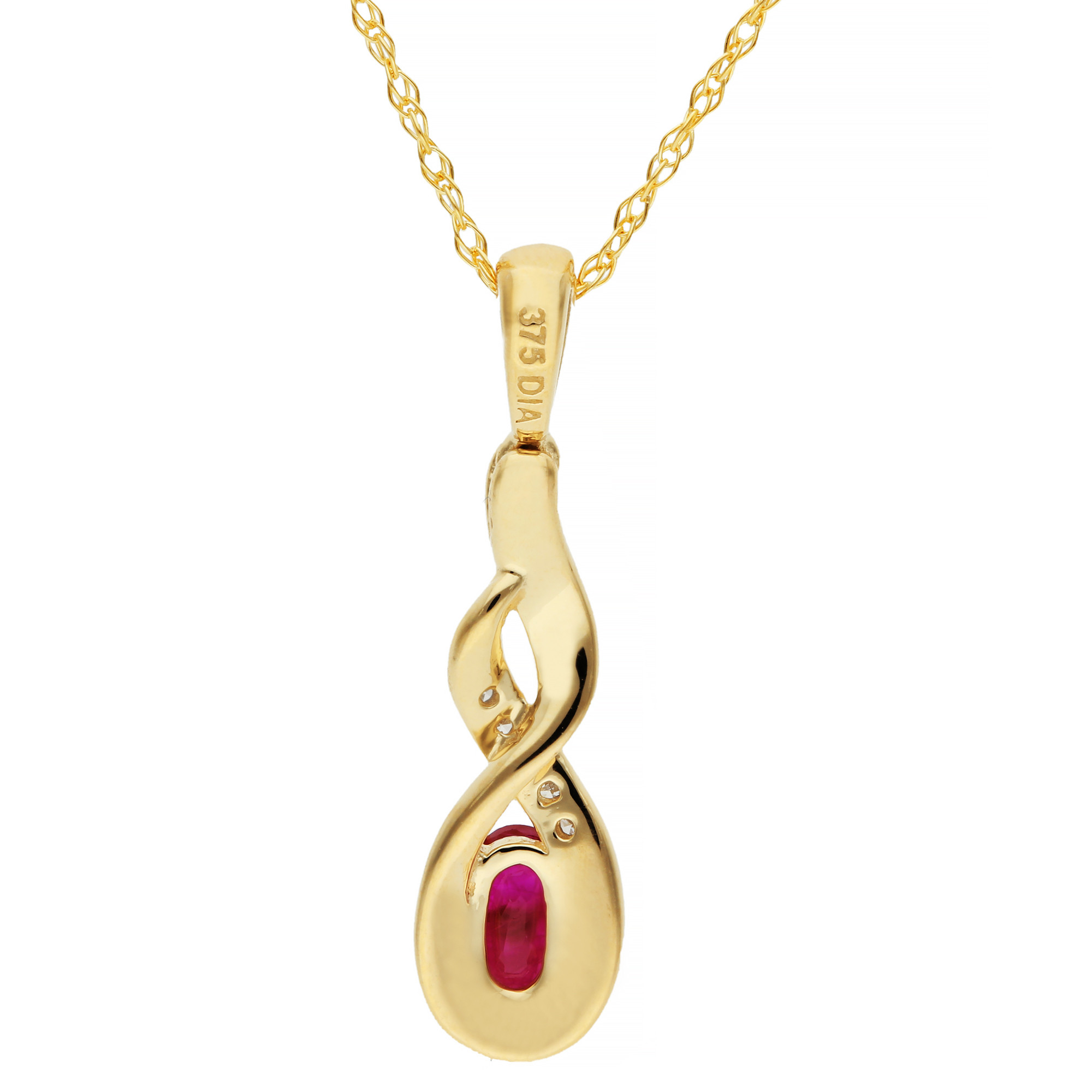 Add a touch of sophistication to your jewellery collection with our 9ct Yellow Gold Diamond & Ruby Pendant, a design that brings elegance and warmth to any look. This pendant features a graceful twist of yellow gold, beautifully adorned with tiny diamonds that lend a subtle sparkle along the curve. At the bottom of the twist, an oval cut ruby is set to showcase its deep red hue, creating a striking contrast against the gold. Suspended from a polished bail and complete with a matching chain, this pendant is ideal for both special occasions and everyday elegance. Whether as a thoughtful gift or a luxurious addition to your collection, this ruby and diamond pendant combines classic beauty with a modern design, making it a piece to be treasured.