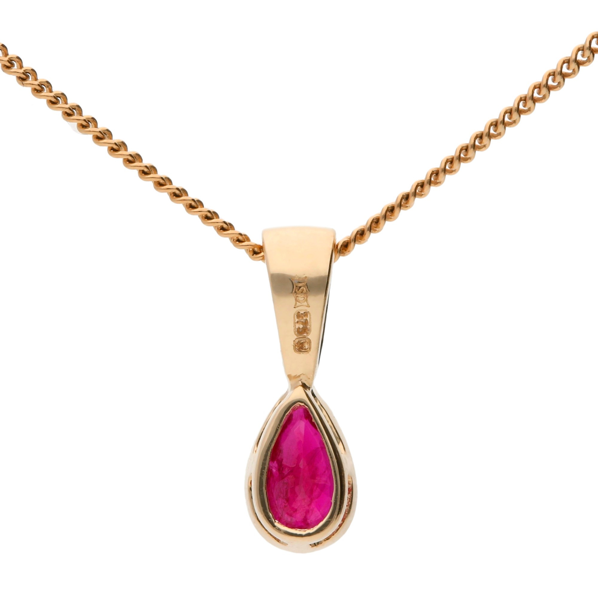Add a touch of elegance to your jewellery collection with this beautiful 9ct yellow gold ruby pendant. Featuring a small 0.10ct teardrop faceted ruby, the gemstone is bezel set in warm yellow gold, creating a timeless and sophisticated design. The vibrant red of the ruby contrasts beautifully with the polished gold, making it a standout piece for any occasion.